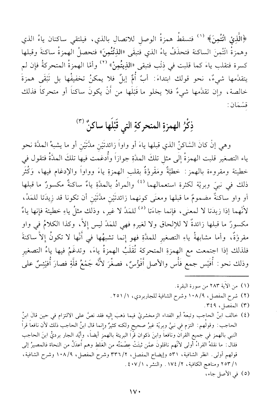 (¬4) خالف ابن الحاجب وتبعه أبو الفداء الزمخشريّ فيما ذهب إليه فقد نصّ على الالتزام في حين قال ابن الحاجب: وقولهم: التزم في نبيّ وبريّة غير صحيح ولكنه كثير وإنما قال ابن الحاجب ذلك لأن نافعا قرأ النبي بالهمز في جميع القرآن ونافعا وابن ذكوان قرا البريئة بالهمز أيضا، وأيّد الجار برديّ ابن الحاجب فقال: ما نقله القراء أولى لأنّهم ناقلون عمّن ثبتت عصمته من الغلط وهم أعدل من النحاة فالمصير إلى قولهم أولى. انظر الشافية، 531 وإيضاح المفصل، 2/ 336 وشرح المفصل، 9/ 108 وشرح الشافية، 1/ 253 ومناهج الكافية، 2/ 174. والنشر، 1/ 407.