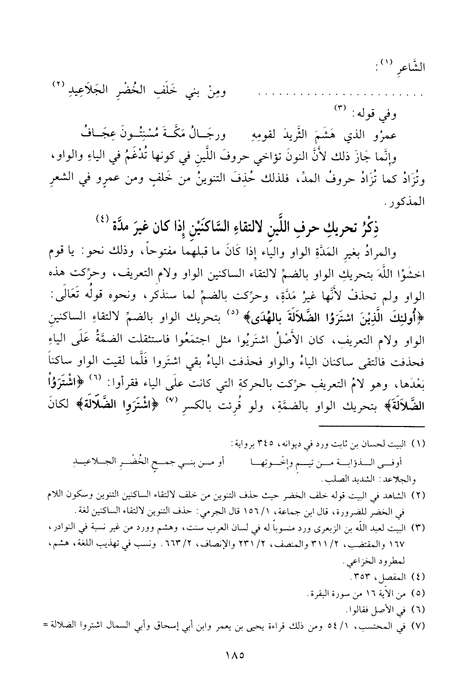 (¬2) الشاهد في البيت قوله خلف الخضر حيث حذف التنوين من خلف لالتقاء الساكنين التنوين وسكون اللام في الخضر للضرورة، قال ابن جماعة، 1/ 156 قال الجرمي: حذف التنوين لالتقاء الساكنين لغة.