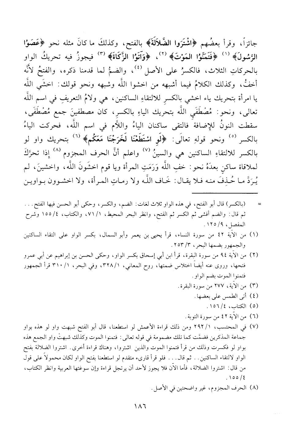 جائزا، وقرأ بعضهم اشتروا الضلالة بالفتح، وكذلك ما كان مثله نحو عَصَوُا الرَّسُولَ (¬1) فَتَمَنَّوُا الْمَوْتَ (¬2)، وَآتَوُا الزَّكاةَ (¬3) فيجوز فيه تحريك الواو بالحركات الثلاث، فالكسر على الأصل (¬4)، والضمّ لما قدمنا ذكره، والفتح لأنّه أخفّ، وكذلك الكلام فيما أشبهه من اخشوا الله وشبهه ونحو قولك: اخشي الله يا امرأة بتحريك ياء اخشي بالكسر للالتقاء الساكنين، هي ولام التعريف في اسم الله تعالى، ونحو: مصطفي الله بتحريك الياء بالكسر، كان مصطفين جمع مصطفى، سقطت النون للإضافة فالتقى ساكنان الياء واللّام في اسم الله، فحركت الياء بالكسر (¬5) ونحو قوله تعالى: لَوِ اسْتَطَعْنا لَخَرَجْنا مَعَكُمْ (¬6) بتحريك واو لو بالكسر للالتقاء الساكنين هي والسين (¬7) واعلم أنّ الحرف المجزوم (¬8) إذا تحرّك لملاقاة ساكن بعده نحو: خف الله ورمت المرأة ويا قوم اخشون الله، واخشين، لم يردّ ما حذف منه فلا يقال: خاف الله ولا رمات المرأة، ولا اخشوون بواوين