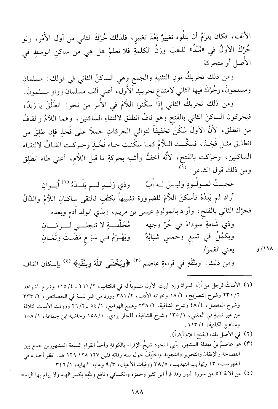 ومن ذلك تحريك نون التثنية والجمع وهي الساكن الثاني في قولك: مسلمان ومسلمون، وحرّك فيها الثاني لامتناع تحريك الأول، أعني ألف مسلمان وواو مسلمون.