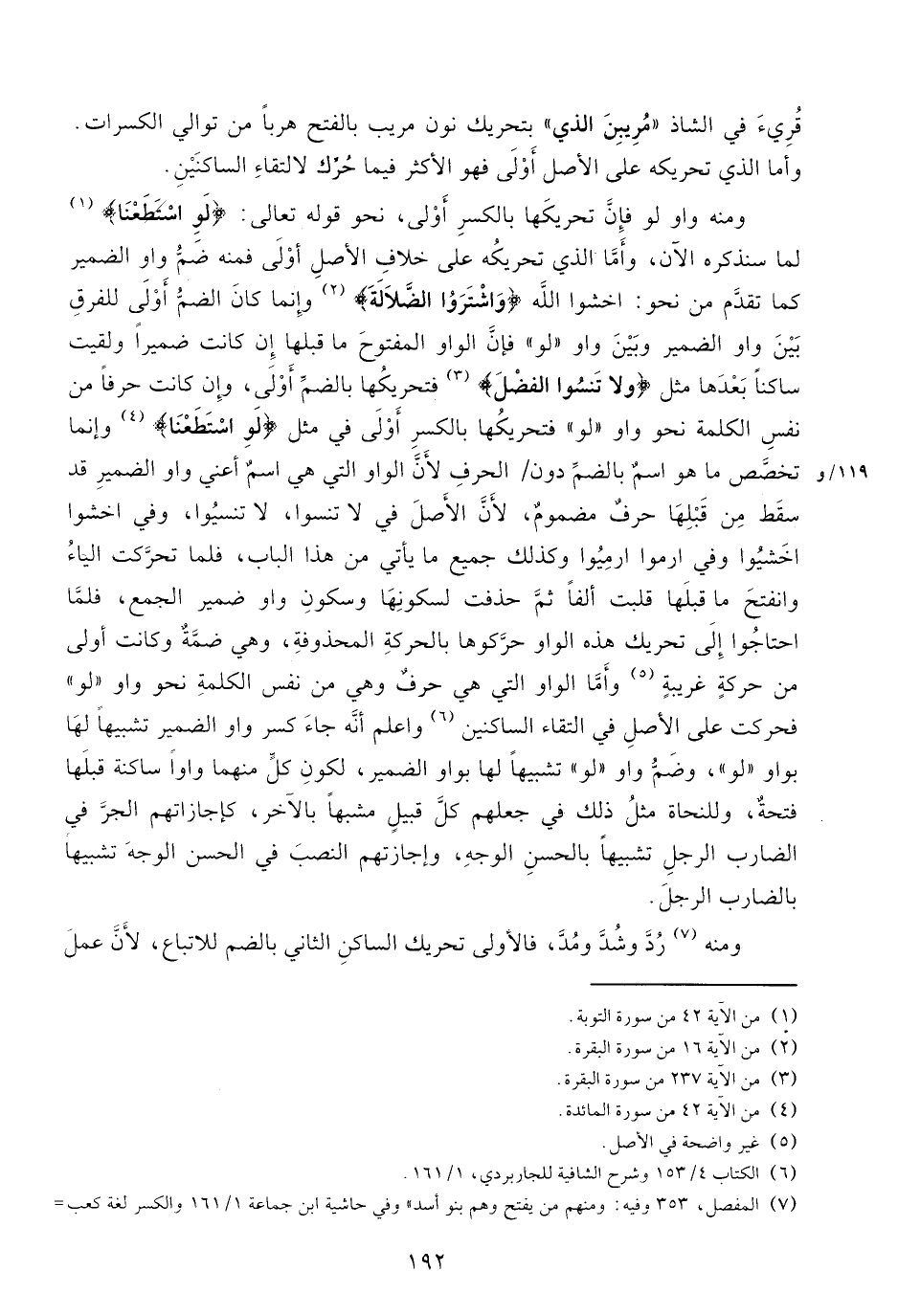 ومنه واو لو فإنّ تحريكها بالكسر أولى، نحو قوله تعالى: لَوِ اسْتَطَعْنا (¬1) لما سنذكره الآن، وأمّا الذي تحريكه على خلاف الأصل أولى فمنه ضمّ واو الضمير كما تقدّم من نحو: اخشوا الله اشْتَرَوُا الضَّلالَةَ (¬2) وإنما كان الضمّ أولى للفرق بين واو الضمير وبين واو «لو» فإنّ الواو المفتوح ما قبلها إن كانت ضميرا ولقيت ساكنا بعدها مثل وَلا تَنْسَوُا الْفَضْلَ (¬3) فتحريكها بالضمّ أولى، وإن كانت حرفا من نفس الكلمة نحو واو «لو» فتحريكها بالكسر أولى في مثل لَوِ اسْتَطَعْنا (¬4) وإنما تخصّص ما هو اسم بالضمّ دون/ الحرف لأنّ الواو التي هي اسم أعني واو الضمير قد سقط من قبلها حرف مضموم، لأنّ الأصل في لا تنسوا، لا تنسيوا، وفي اخشوا اخشيوا وفي ارموا ارميوا وكذلك جميع ما يأتي من هذا الباب، فلما تحرّكت الياء وانفتح ما قبلها قلبت ألفا ثمّ حذفت لسكونها وسكون واو ضمير الجمع، فلمّا احتاجوا إلى تحريك هذه الواو حرّكوها بالحركة المحذوفة، وهي ضمّة وكانت أولى من حركة غريبة (¬5) وأمّا الواو التي هي حرف وهي من نفس الكلمة نحو واو «لو» فحركت على الأصل في التقاء الساكنين (¬6) واعلم أنّه جاء كسر واو الضمير تشبيها لها بواو «لو»، وضمّ واو «لو» تشبيها لها بواو الضمير، لكون كلّ منهما واوا ساكنة قبلها فتحة، وللنحاة مثل ذلك في جعلهم كلّ قبيل مشبها بالآخر، كإجازاتهم الجرّ في الضارب الرجل تشبيها بالحسن الوجه، وإجازتهم النصب في الحسن الوجه تشبيها بالضارب الرجل.