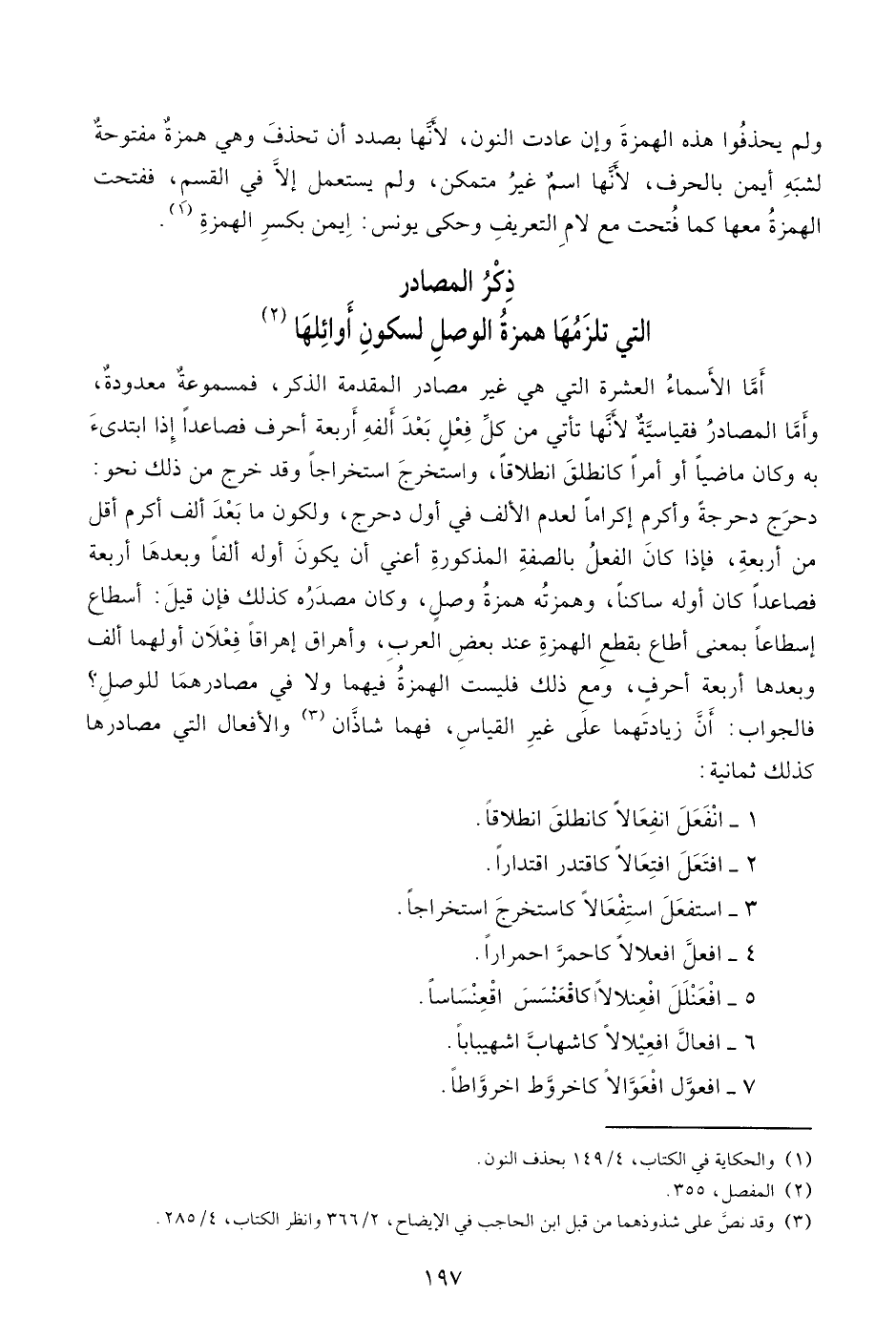 أمّا الأسماء العشرة التي هي غير مصادر المقدمة الذكر، فمسموعة معدودة، وأمّا المصادر فقياسيّة لأنّها تأتي من كلّ فعل بعد ألفه أربعة أحرف فصاعدا إذا ابتدئ به وكان ماضيا أو أمرا كانطلق انطلاقا، واستخرج استخراجا وقد خرج من ذلك نحو: