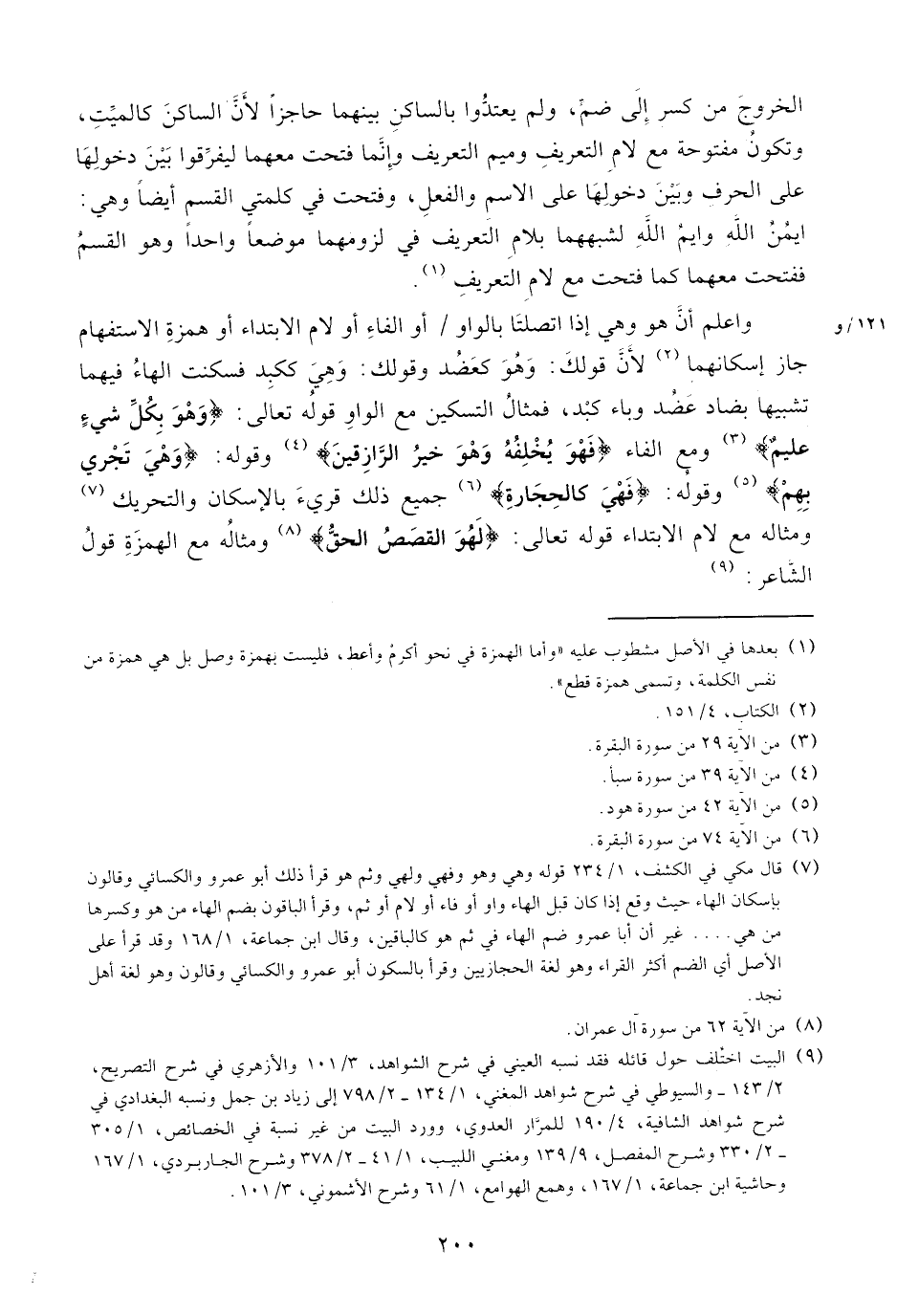 واعلم أنّ هو وهي إذا اتصلتا بالواو/ أو الفاء أو لام الابتداء أو همزة الاستفهام جاز إسكانهما (¬2) لأنّ قولك: وهو كعضد وقولك: وهي ككبد فسكنت الهاء فيهما تشبيها بضاد عضد وباء كبد، فمثال التسكين مع الواو قوله تعالى: وَهُوَ بِكُلِّ شَيْءٍ عَلِيمٌ (¬3) ومع الفاء فَهُوَ يُخْلِفُهُ وَهُوَ خَيْرُ الرَّازِقِينَ (¬4) وقوله: وَهِيَ تَجْرِي بِهِمْ (¬5) وقوله: فَهِيَ كَالْحِجارَةِ (¬6) جميع ذلك قريء بالإسكان والتحريك (¬7) ومثاله مع لام الابتداء قوله تعالى: لَهُوَ الْقَصَصُ الْحَقُّ (¬8) ومثاله مع الهمزة قول الشّاعر: (¬9)