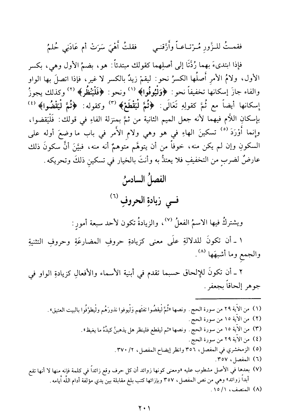 (¬7) بعدها في الأصل مشطوب عليه «ومعنى كونها زوائد أن كل حرف وقع زائدا في كلمة فإنه منها لا أنها تقع أبدا زوائد» وهي من نص المفصل، 357 وبإزائها كتب بلغ مقابلة بين يدي مؤلفة أدام الله أيامه.