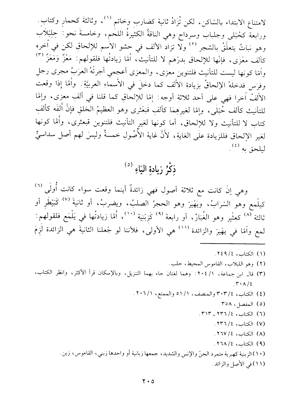 ورابعة كحبلى وجلباب وسرداح وهي الناقة الكثيرة اللحم، وخامسة نحو: حلبلاب وهو نبات يتعلّق بالشجر (¬2) ولا تزاد الألف في حشو الاسم للإلحاق لكن في آخره كألف معزى، فإنّها للإلحاق بدرهم لا للتأنيث، أمّا زيادتها فلقولهم: معز ومعز (¬3) وأمّا كونها ليست للتأنيث فلتنوين معزى، والمعزى أعجمي أجرته العرب مجرى رجل وفرس فدخله الإلحاق بزيادة الألف كما دخل في الأسماء العربيّة. وأمّا إذا وقعت الألف آخرا فهي على أحد ثلاثة أوجه: إمّا للإلحاق كما قلنا في ألف معزى، وإمّا للتأنيث كألف حبلى، وإمّا لغيرهما كألف قبعثرى وهو العظيم الخلق فإنّ ألفه كألف كتاب لا للتأنيث ولا للإلحاق، أما كونها لغير التأنيث فلتنوين قبعثرى، وأمّا كونها لغير الإلحاق فللزيادة على الغاية، لأنّ غاية الأصول خمسة وليس لهم أصل سداسيّ ليلحق به (¬4).
