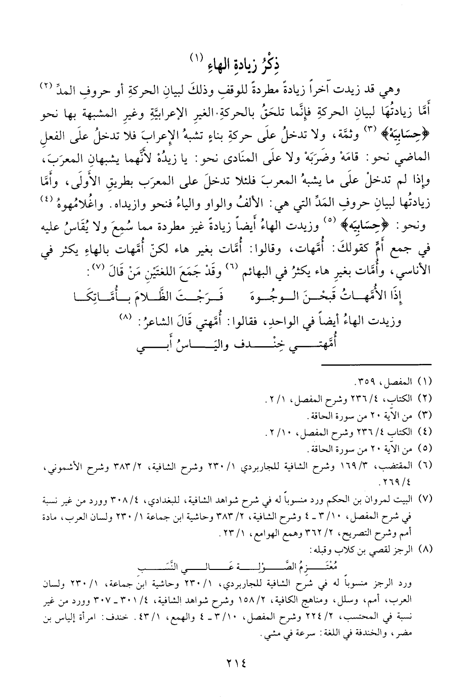 وهي قد زيدت آخرا زيادة مطردة للوقف وذلك لبيان الحركة أو حروف المدّ (¬2) أمّا زيادتها لبيان الحركة فإنّما تلحق بالحركة الغير الإعرابيّة وغير المشبهة بها نحو حِسابِيَهْ (¬3) وثمّة، ولا تدخل على حركة بناء تشبه الإعراب فلا تدخل على الفعل الماضي نحو: قامه وضربه ولا على المنادى نحو: يا زيده لأنّهما يشبهان المعرب، وإذا لم تدخل على ما يشبه المعرب فلئلا تدخل على المعرب بطريق الأولى، وأمّا زيادتها لبيان حروف المدّ التي هي: الألف والواو والياء فنحو وا زيداه. وا غلامهوه (¬4) ونحو: حِسابِيَهْ (¬5) وزيدت الهاء أيضا زيادة غير مطردة مما سمع ولا يقاس عليه في جمع أمّ كقولك: أمّهات، وقالوا: أمّات بغير هاء لكنّ أمّهات بالهاء يكثر في الأناسي، وأمّات بغير هاء يكثر في البهائم (¬6) وقد جمع اللغتين من قال (¬7):
