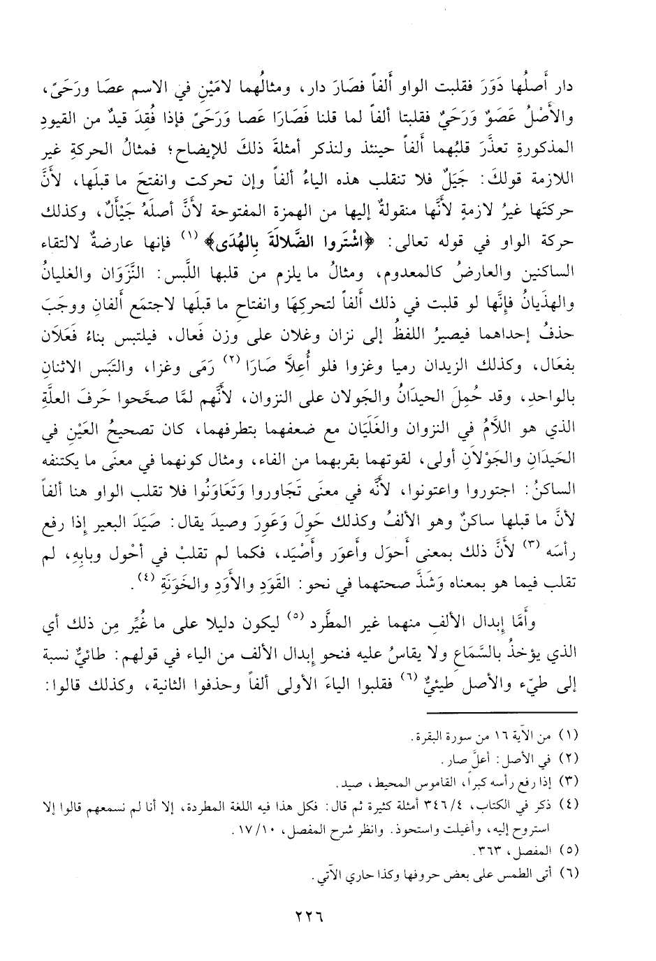 دار أصلها دور فقلبت الواو ألفا فصار دار، ومثالهما لامين في الاسم عصا ورحى، والأصل عصو ورحي فقلبتا ألفا لما قلنا فصارا عصا ورحى فإذا فقد قيد من القيود المذكورة تعذّر قلبهما ألفا حينئذ ولنذكر أمثلة ذلك للإيضاح؛ فمثال الحركة غير اللازمة قولك: جيل فلا تنقلب هذه الياء ألفا وإن تحركت وانفتح ما قبلها، لأنّ حركتها غير لازمة لأنّها منقولة إليها من الهمزة المفتوحة لأنّ أصله جيأل، وكذلك حركة الواو في قوله تعالى: اشْتَرَوُا الضَّلالَةَ بِالْهُدى (¬1) فإنها عارضة لالتقاء الساكنين والعارض كالمعدوم، ومثال ما يلزم من قبلها اللّبس: النّزوان والغليان والهذيان فإنّها لو قلبت في ذلك ألفا لتحركها وانفتاح ما قبلها لاجتمع ألفان ووجب حذف إحداهما فيصير اللفظ إلى نزان وغلان على وزن فعال، فيلتبس بناء فعلان بفعال، وكذلك الزيدان رميا وغزوا فلو أعلّا صارا (¬2) رمى وغزا، والتبس الاثنان بالواحد، وقد حمل الحيدان والجولان على النزوان، لأنّهم لمّا صحّحوا حرف العلّة الذي هو اللّام في النزوان والغليان مع ضعفهما بتطرفهما، كان تصحيح العين في الحيدان والجولان أولى، لقوتهما بقربهما من الفاء، ومثال كونهما في معنى ما يكتنفه الساكن: اجتوروا واعتونوا، لأنّه في معنى تجاوروا وتعاونوا فلا تقلب الواو هنا ألفا لأنّ ما قبلها ساكن وهو الألف وكذلك حول وعور وصيد يقال: صيد البعير إذا رفع رأسه (¬3) لأنّ ذلك بمعنى أحول وأعور وأصيد، فكما لم تقلب في أحول وبابه، لم تقلب فيما هو بمعناه وشذّ صحتهما في نحو: القود والأود والخونة (¬4).