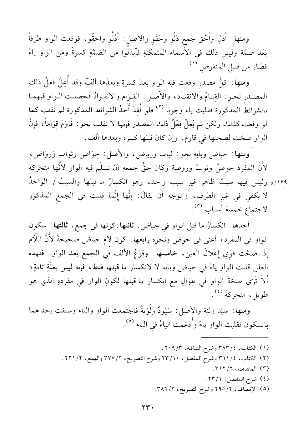 أحدها: انكسار ما قبل الواو في حياض. ثانيها: كونها في جمع، ثالثها: سكون الواو في المفرد، أعني في حوض ونحوه رابعها: كون لام حياض صحيحة لأنّ اللّام إذا صحّت قوي إعلال العين، خامسها: وقوع الألف في الجمع بعد الواو. فلهذه العلل قلبت الواو ياء في حياض وبابه لا لانكسار ما قبلها فقط، فإنه ليس بعلّة تامة؛ ألا ترى صحّة الواو في طوال مع انكسار ما قبلها لكون الواو في مفرده الذي هو طويل، متحركة (¬4).