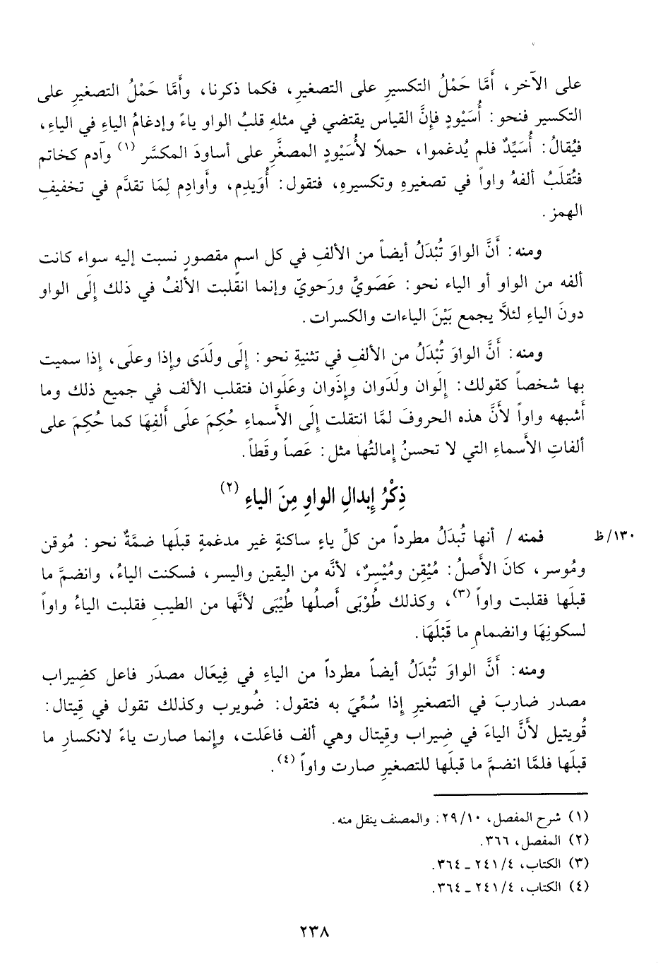 ومنه: أنّ الواو تبدل أيضا من الألف في كل اسم مقصور نسبت إليه سواء كانت ألفه من الواو أو الياء نحو: عصويّ ورحويّ وإنما انقلبت الألف في ذلك إلى الواو دون الياء لئلّا يجمع بين الياءات والكسرات.