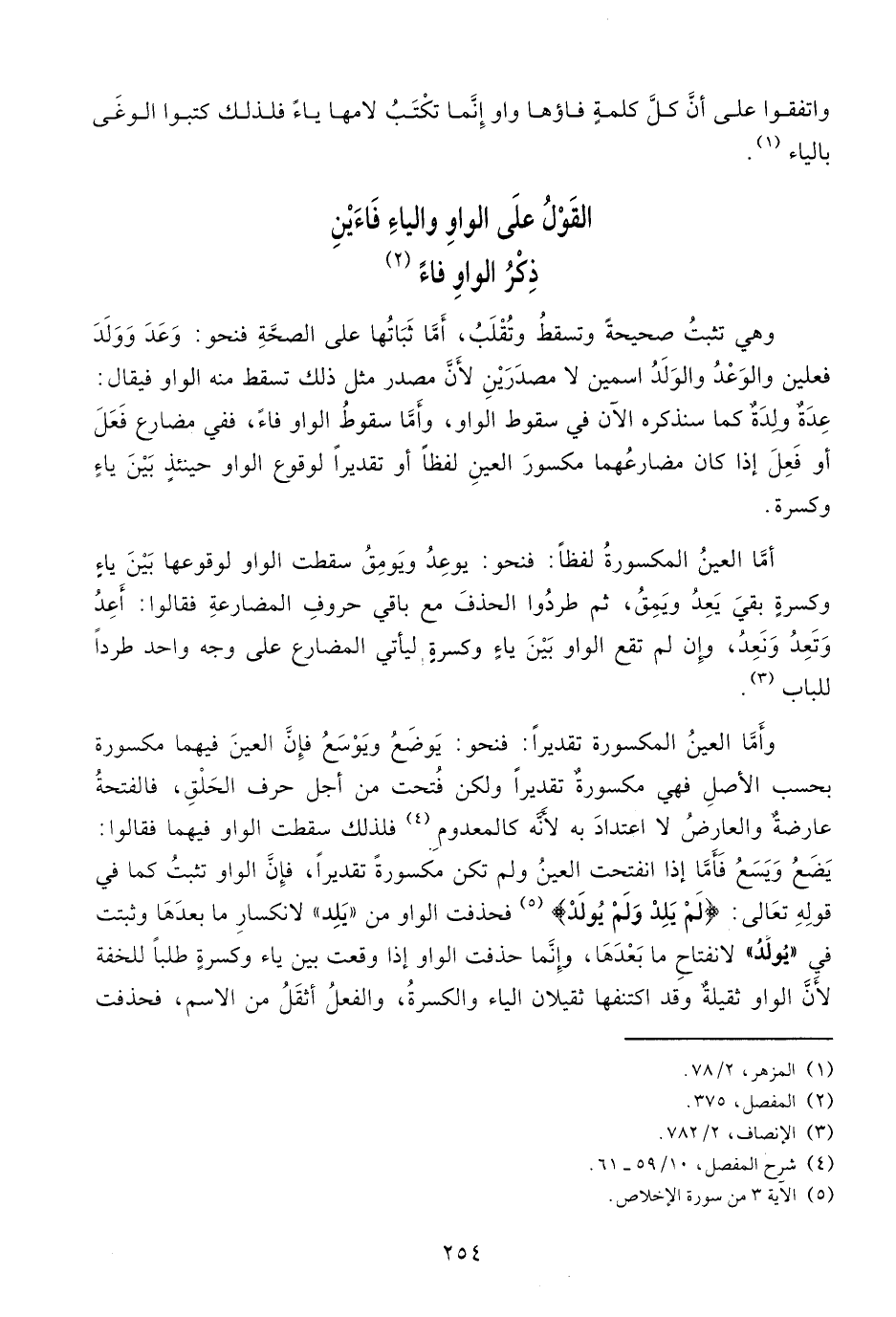 وهي تثبت صحيحة وتسقط وتقلب، أمّا ثباتها على الصحّة فنحو: وعد وولد فعلين والوعد والولد اسمين لا مصدرين لأنّ مصدر مثل ذلك تسقط منه الواو فيقال: