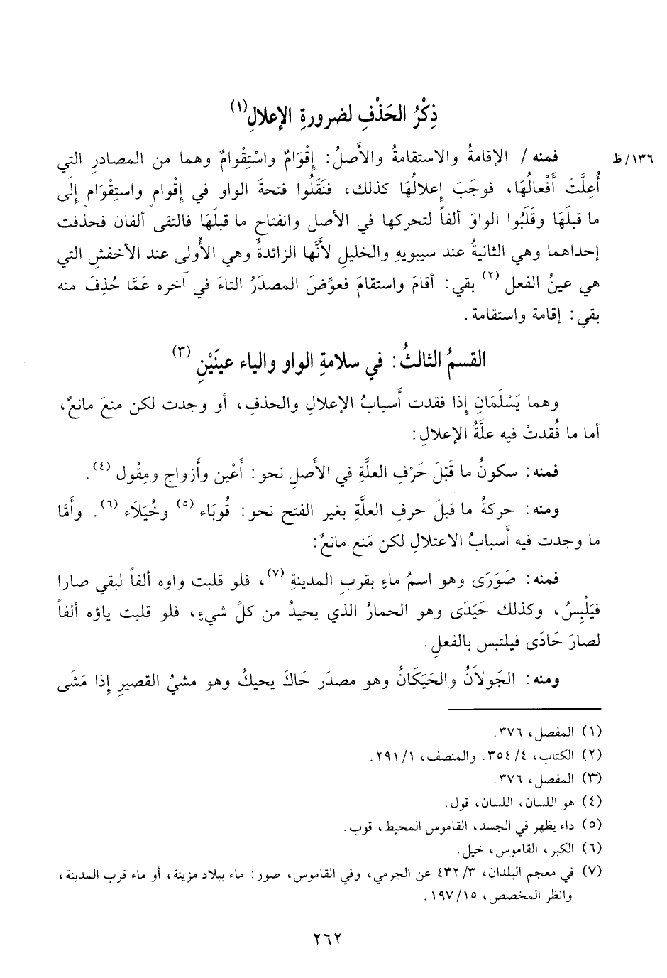 فمنه/ الإقامة والاستقامة والأصل: إقوام واستقوام وهما من المصادر التي أعلّت أفعالها، فوجب إعلالها كذلك، فنقلوا فتحة الواو في إقوام واستقوام إلى ما قبلها وقلبوا الواو ألفا لتحركها في الأصل وانفتاح ما قبلها فالتقى ألفان فحذفت إحداهما وهي الثانية عند سيبويه والخليل لأنّها الزائدة وهي الأولى عند الأخفش التي هي عين الفعل (¬2) بقي: أقام واستقام فعوّض المصدر التاء في آخره عمّا حذف منه بقي: إقامة واستقامة.