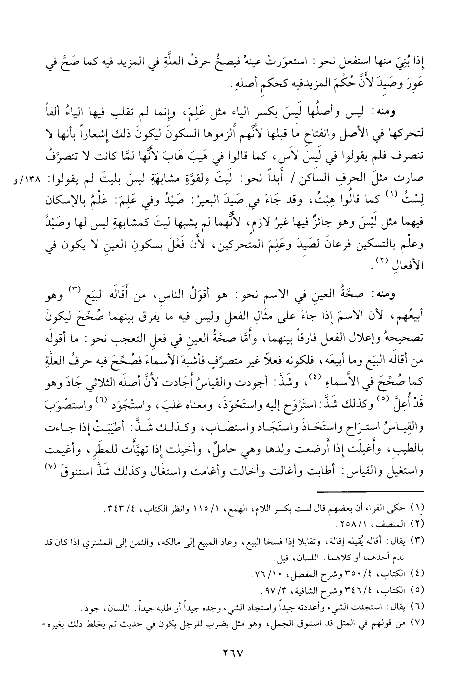 ومنه: صحّة العين في الاسم نحو: هو أقول الناس، من أقاله البيع (¬3) وهو أبيعهم، لأن الاسم إذا جاء على مثال الفعل وليس فيه ما يفرق بينهما صحّح ليكون تصحيحه وإعلال الفعل فارقا بينهما، وأمّا صحّة العين في فعل التعجب نحو: ما أقوله من أقاله البيع وما أبيعه، فلكونه فعلا غير متصرّف فأشبه الأسماء فصحّح فيه حرف العلّة كما صحّح في الأسماء (¬4)، وشذّ: أجودت والقياس أجادت لأنّ أصله الثلاثي جاد وهو قد أعلّ (¬5) وكذلك شذّ: استروح إليه واستحوذ، ومعناه غلب، واستجود (¬6) واستصوب والقياس استراح واستحاذ واستجاد واستصاب، وكذلك شذّ: أطيبت إذا جاءت بالطيب، وأغيلت إذا أرضعت ولدها وهي حامل، وأخيلت إذا تهيّأت للمطر، وأغيمت واستغيل والقياس: أطابت وأغالت وأخالت وأغامت واستغال وكذلك شذّ استنوق (¬7)