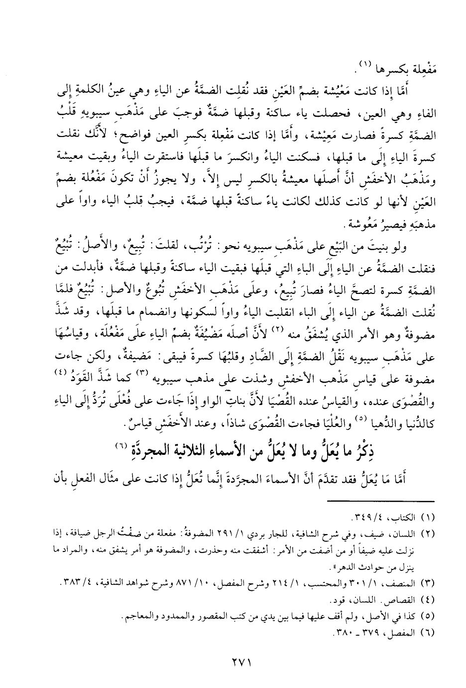 ساكنة وقبلها ضمّة فوجب على مذهب سيبويه قلب الضمّة كسرة فصارت معيشة، وأمّا إذا كانت مفعلة بكسر العين فواضح؛ لأنّك نقلت كسرة الياء إلى ما قبلها، فسكنت الياء وانكسر ما قبلها فاستقرت الياء وبقيت معيشة ومذهب الأخفش أنّ أصلها معيشة بالكسر ليس إلّا، ولا يجوز أن تكون مفعلة بضمّ العين لأنها لو كانت كذلك لكانت ياء ساكنة قبلها ضمّة، فيجب قلب الياء واوا على مذهبه فيصير معوشة.