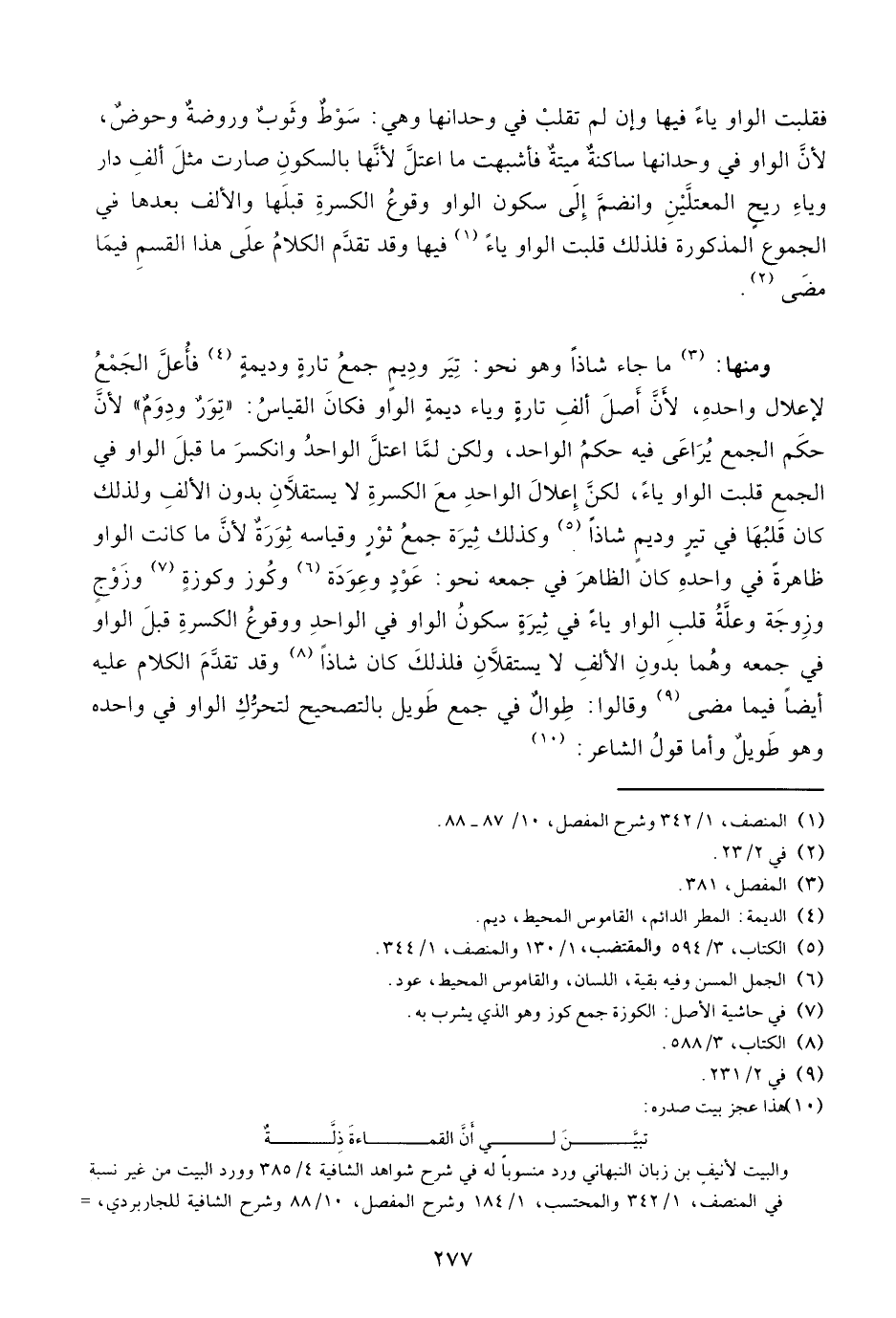 ومنها: (¬3) ما جاء شاذا وهو نحو: تير وديم جمع تارة وديمة (¬4) فأعلّ الجمع لإعلال واحده، لأنّ أصل ألف تارة وياء ديمة الواو فكان القياس: «تور ودوم» لأنّ حكم الجمع يراعى فيه حكم الواحد، ولكن لمّا اعتلّ الواحد وانكسر ما قبل الواو في الجمع قلبت الواو ياء، لكنّ إعلال الواحد مع الكسرة لا يستقلّان بدون الألف ولذلك كان قلبها في تير وديم شاذا (¬5) وكذلك ثيرة جمع ثور وقياسه ثورة لأنّ ما كانت الواو ظاهرة في واحده كان الظاهر في جمعه نحو: عود وعودة (¬6) وكوز وكوزة (¬7) وزوج وزوجة وعلّة قلب الواو ياء في ثيرة سكون الواو في الواحد ووقوع الكسرة قبل الواو في جمعه وهما بدون الألف لا يستقلّان فلذلك كان شاذا (¬8) وقد تقدّم الكلام عليه أيضا فيما مضى (¬9) وقالوا: طوال في جمع طويل بالتصحيح لتحرّك الواو في واحده وهو طويل وأما قول الشاعر: (¬10)