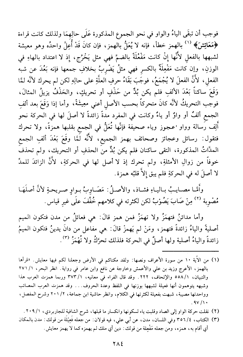(¬1) من الآية 10 من سورة الأعراف ونصها: ولقد مكناكم في الأرض وجعلنا لكم فيها معايش. «قرأها بالهمز، الأعرج وزيد بن علي والأعمش وخارجة عن نافع وابن عامر في رواية. انظر البحر، 1/ 271 والتبيان، 1/ 558 والإتحاف، 222. وقد قال الفراء في معانيه، 1/ 373 وربما همزت العرب هذا وشبهه يتوهمون أنها فعيلة لشبهها بوزنها في اللفظ وعدة الحروف ... وقد همزت العرب المصائب وواحدتها مصيبة، شبهت بفعيلة لكثرتها في الكلام، وانظر حاشية ابن جماعة، 2/ 201 وشرح المفصل، 10/ 97.