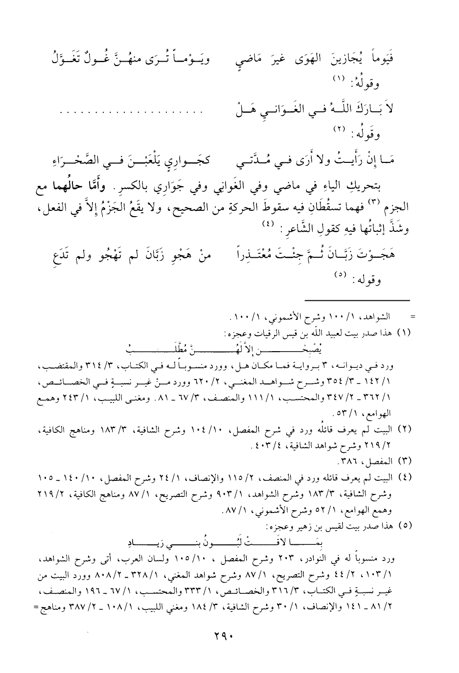 بتحريك الياء في ماضي وفي الغواني وفي جواري بالكسر. وأمّا حالهما مع الجزم (¬3) فهما تسقطان فيه سقوط الحركة من الصحيح، ولا يقع الجزم إلّا في الفعل، وشذّ إثباتها فيه كقول الشّاعر: (¬4)