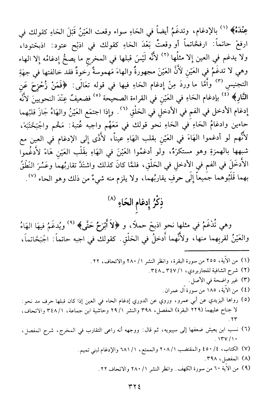 وهي تدغم في مثلها نحو اذبحّ حملا، ولا أَبْرَحُ حَتَّى (¬9) ويدغم فيها الهاء والعين لقربهما منها، ولأنّهما أدخل في الحلق. كقولك في اجبه حاتما: اجبحّاتما،
