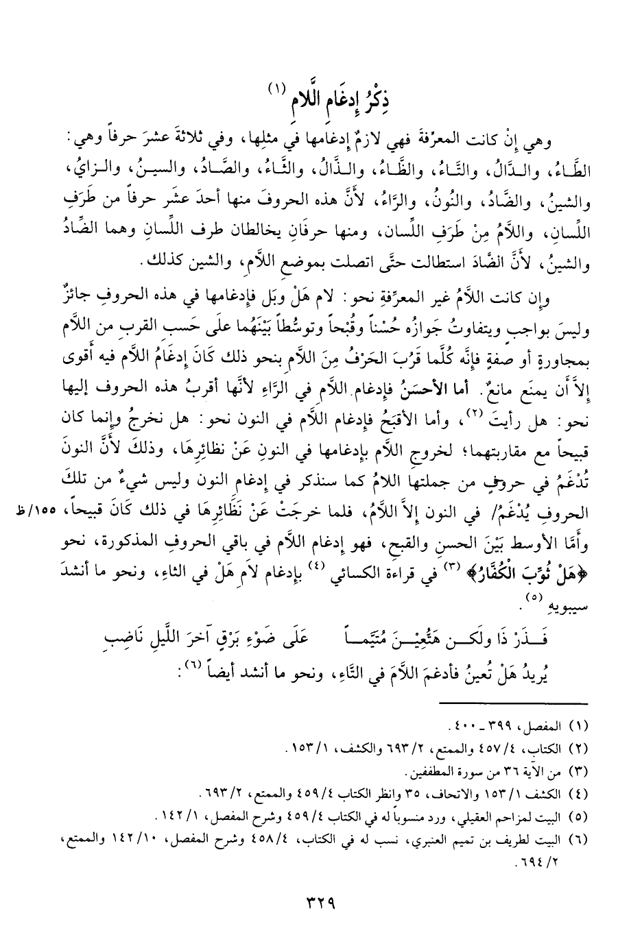 وإن كانت اللّام غير المعرّفة نحو: لام هل وبل فإدغامها في هذه الحروف جائز وليس بواجب ويتفاوت جوازه حسنا وقبحا وتوسّطا بينهما على حسب القرب من اللّام بمجاورة أو صفة فإنّه كلّما قرب الحرف من اللّام بنحو ذلك كان إدغام اللّام فيه أقوى إلّا أن يمنع مانع. أما الأحسن فإدغام اللّام في الرّاء لأنّها أقرب هذه الحروف إليها نحو: هل رأيت (¬2)، وأما الأقبح فإدغام اللّام في النون نحو: هل نخرج وإنما كان قبيحا مع مقاربتهما؛ لخروج اللّام
