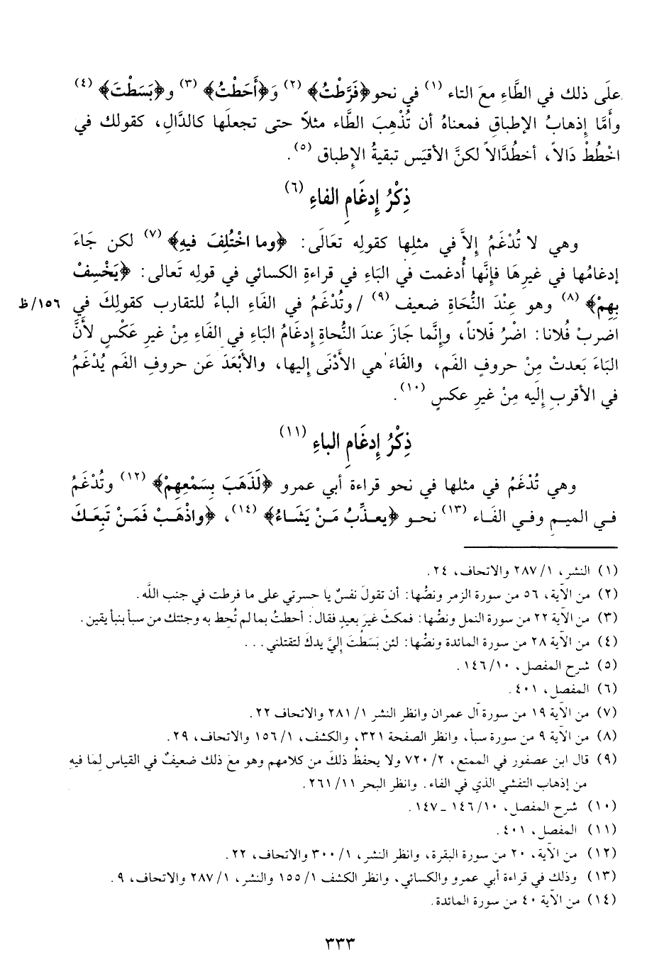 (¬9) قال ابن عصفور في الممتع، 2/ 720 ولا يحفظ ذلك من كلامهم وهو مع ذلك ضعيف في القياس لما فيه من إذهاب التفشي الذي في الفاء. وانظر البحر 11/ 261.