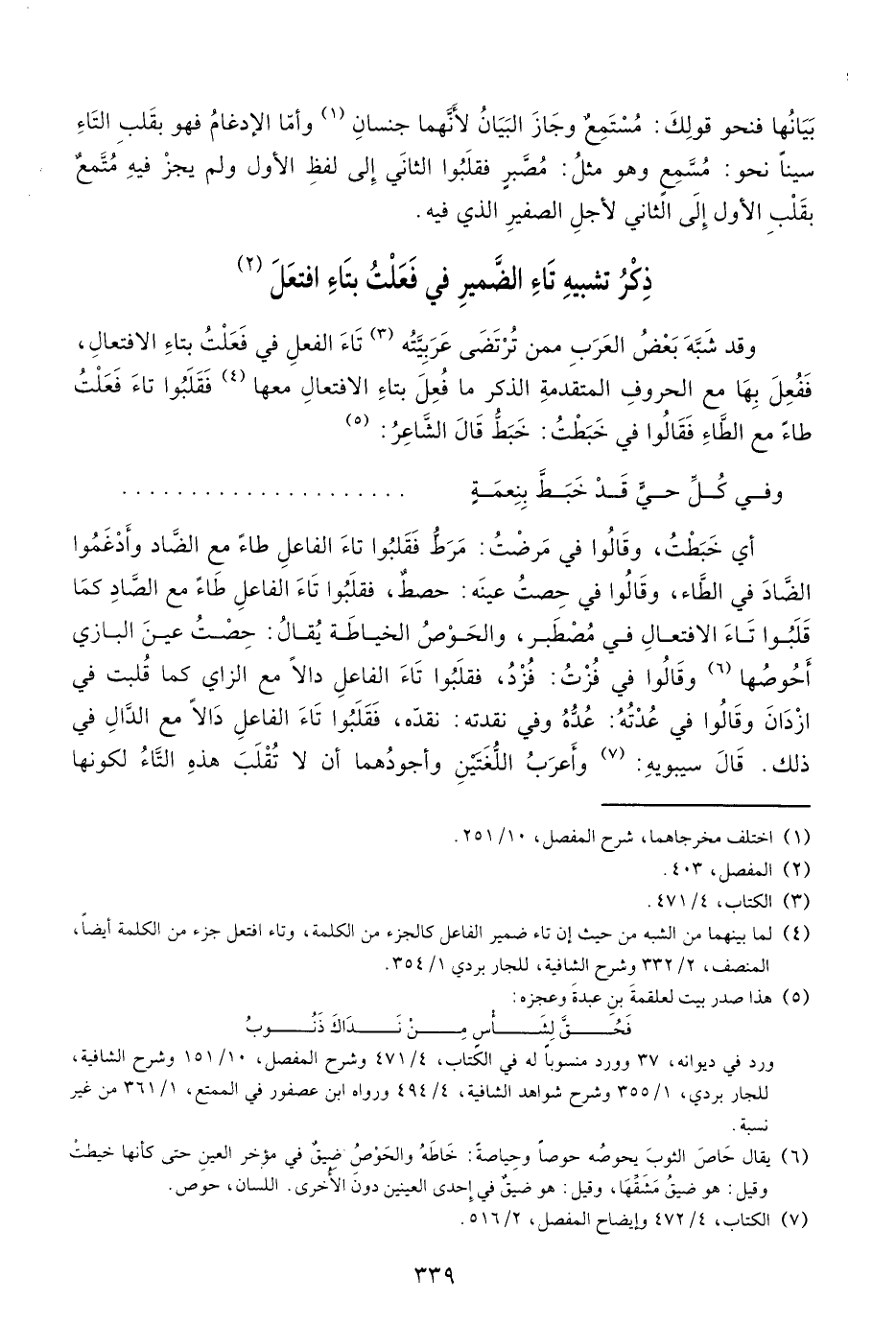 (¬4) لما بينهما من الشبه من حيث إن تاء ضمير الفاعل كالجزء من الكلمة، وتاء افتعل جزء من الكلمة أيضا، المنصف، 2/ 332 وشرح الشافية، للجاربردي 1/ 354.