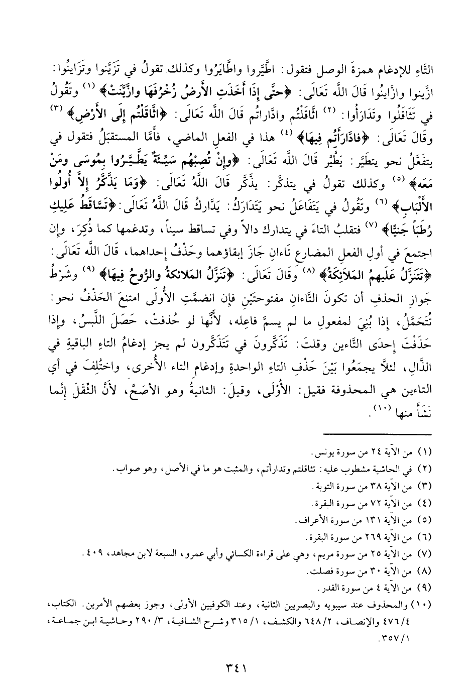 ازّينوا وازّاينوا قال الله تعالى: حَتَّى إِذا أَخَذَتِ الْأَرْضُ زُخْرُفَها وَازَّيَّنَتْ (¬1) وتقول في تثاقلوا وتدارأوا: (¬2) اثّاقلتم وادّاراتم قال الله تعالى: اثَّاقَلْتُمْ إِلَى الْأَرْضِ (¬3) وقال تعالى: فَادَّارَأْتُمْ فِيها (¬4) هذا في الفعل الماضي، فأمّا المستقبل فتقول في يتفعّل نحو يتطيّر: يطّيّر قال الله تعالى: وَإِنْ تُصِبْهُمْ سَيِّئَةٌ يَطَّيَّرُوا بِمُوسى وَمَنْ مَعَهُ (¬5) وكذلك تقول في يتذكّر: يذّكّر قال الله تعالى: وَما يَذَّكَّرُ إِلَّا أُولُوا الْأَلْبابِ (¬6) وتقول في يتفاعل نحو يتدارك: يدّارك قال الله تعالى: تُساقِطْ عَلَيْكِ رُطَباً جَنِيًّا (¬7) فتقلب التاء في يتدارك دالا وفي تساقط سينا، وتدغمها كما ذكر، وإن اجتمع في أول الفعل المضارع تاءان جاز إبقاؤهما وحذف إحداهما، قال الله تعالى: