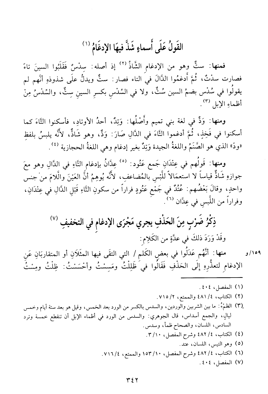 (¬6) الكتاب، 4/ 482 وشرح المفصل، 10/ 153 والممتع، 4/ 716.