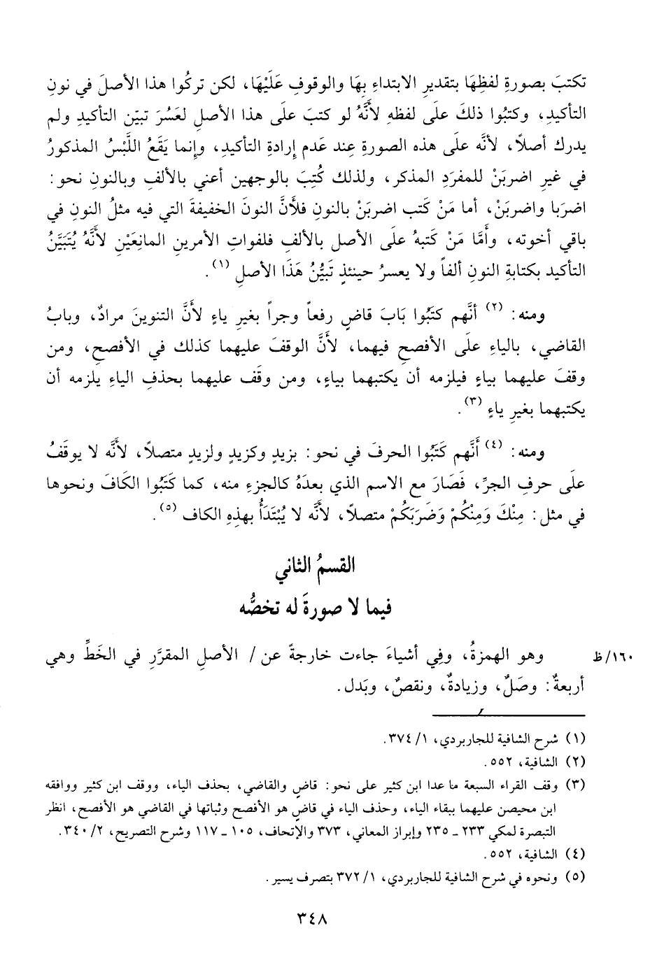 ومنه: (¬2) أنّهم كتبوا باب قاض رفعا وجرا بغير ياء لأنّ التنوين مراد، وباب القاضي، بالياء على الأفصح فيهما، لأنّ الوقف عليهما كذلك في الأفصح، ومن وقف عليهما بياء فيلزمه أن يكتبهما بياء، ومن وقف عليهما بحذف الياء يلزمه أن يكتبهما بغير ياء (¬3).