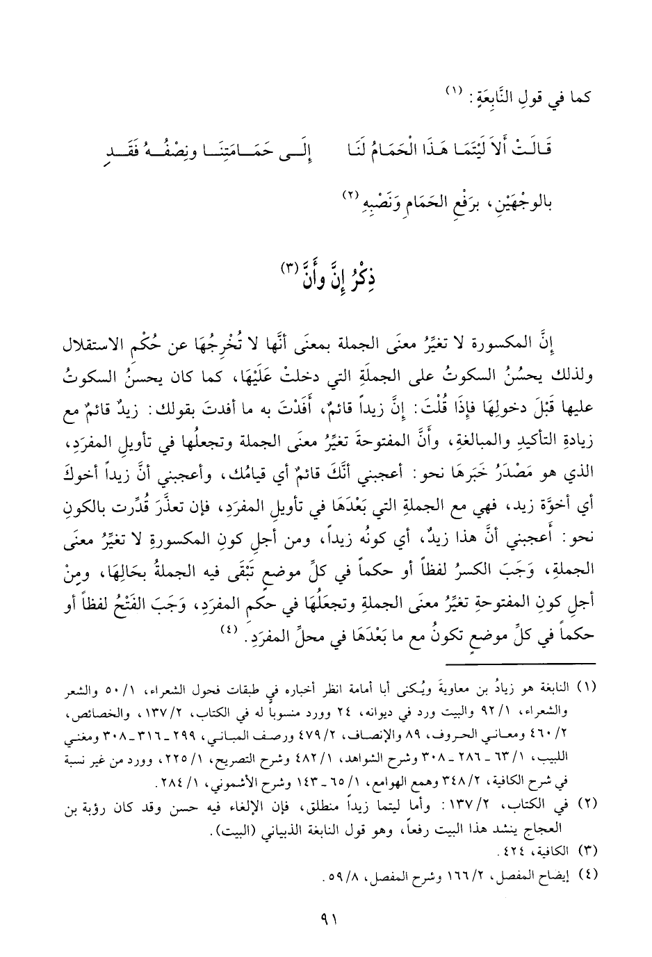 إنّ المكسورة لا تغيّر معنى الجملة بمعنى أنّها لا تخرجها عن حكم الاستقلال ولذلك يحسن السكوت على الجملة التي دخلت عليها، كما كان يحسن السكوت عليها قبل دخولها فإذا قلت: إنّ زيدا قائم، أفدت به ما أفدت بقولك: زيد قائم مع زيادة التأكيد والمبالغة، وأنّ المفتوحة تغيّر معنى الجملة وتجعلها في تأويل المفرد، الذي هو مصدر خبرها نحو: أعجبني أنّك قائم أي قيامك، وأعجبني أنّ زيدا أخوك أي أخوّة زيد، فهي مع الجملة التي بعدها في تأويل المفرد، فإن تعذّر قدّرت بالكون نحو: أعجبني أنّ هذا زيد، أي كونه زيدا، ومن أجل كون المكسورة لا تغيّر معنى الجملة، وجب الكسر لفظا أو حكما في كلّ موضع تبقى فيه الجملة بحالها، ومن أجل كون المفتوحة تغيّر معنى الجملة وتجعلها في حكم المفرد، وجب الفتح لفظا أو حكما في كلّ موضع تكون مع ما بعدها في محلّ المفرد. (¬4)