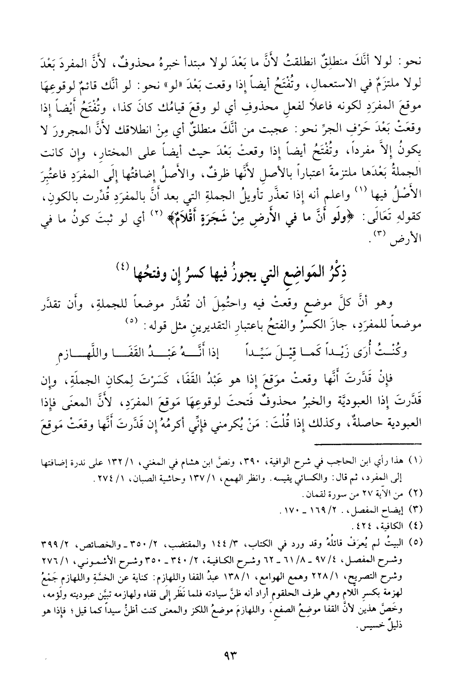 نحو: لولا أنّك منطلق انطلقت لأنّ ما بعد لولا مبتدأ خبره محذوف، لأنّ المفرد بعد لولا ملتزم في الاستعمال، وتفتح أيضا إذا وقعت بعد «لو» نحو: لو أنّك قائم لوقوعها موقع المفرد لكونه فاعلا لفعل محذوف أي لو وقع قيامك كان كذا، وتفتح أيضا إذا وقعت بعد حرف الجرّ نحو: عجبت من أنّك منطلق أي من انطلاقك لأنّ المجرور لا يكون إلّا مفردا، وتفتح أيضا إذا وقعت بعد حيث أيضا على المختار، وإن كانت الجملة بعدها ملتزمة اعتبارا بالأصل لأنّها ظرف، والأصل إضافتها إلى المفرد فاعتبر الأصل فيها (¬1) واعلم أنه إذا تعذّر تأويل الجملة التي بعد أنّ بالمفرد قدّرت بالكون، كقوله تعالى: وَلَوْ أَنَّما فِي الْأَرْضِ مِنْ شَجَرَةٍ أَقْلامٌ (¬2) أي لو ثبت كون ما في الأرض (¬3).