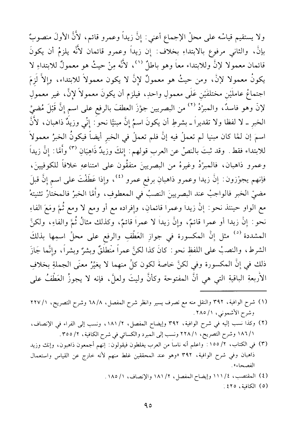 (¬3) في الكتاب، 2/ 155: واعلم أنه ناسا من العرب يغلطون فيقولون: إنهم أجمعون ذاهبون، وإنك وزيد ذاهبان وفي شرح الوافية، 392 «وهو عند المحققين غلط منهم لأنه خارج عن القياس واستعمال الفصحاء».