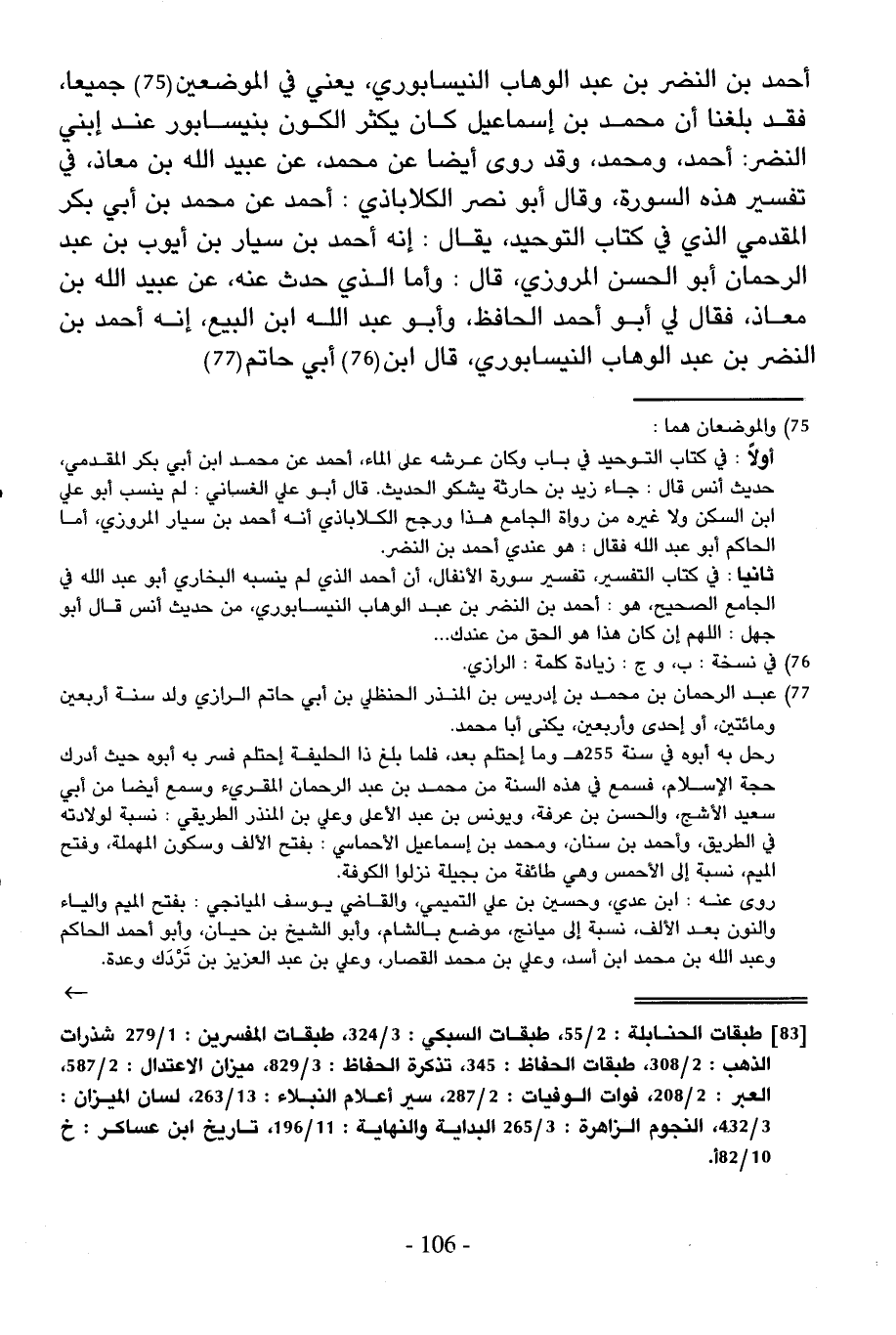 أَحْمد بن النَّضر بن عبد الْوَهَّاب النَّيْسَابُورِي يَعْنِي فِي الْمَوْضِعَيْنِ جَمِيعًا فقد بلغنَا أَن مُحَمَّد بن إِسْمَاعِيل كَانَ يكثر الْكَوْن بنيسابور عِنْد ابْني النَّضر أَحْمد وَمُحَمّد وَقد روى أَيْضا عَن مُحَمَّد عَن عبيد الله بن معَاذ فِي تَفْسِير هَذِه السُّورَة وَقَالَ أَبُو نصر الكلاباذي أَحْمد عَن مُحَمَّد بن أبي بكر الْمقدمِي الَّذِي فِي كتاب التَّوْحِيد يُقَال إِنَّه أَحْمد بن سيار بن ايوب بن عبد الرحمان أَبُو الْحسن الْمروزِي قَالَ وَأما الَّذِي حدث عَنهُ عَن عبيد الله بن معَاذ فَقَالَ لي أَبُو أَحْمد الْحَافِظ وَأَبُو عبد الله ابْن البيع إِنَّه أَحْمد بن النَّضر بن عبد الْوَهَّاب النَّيْسَابُورِي قَالَ ابْن أبي حَاتِم