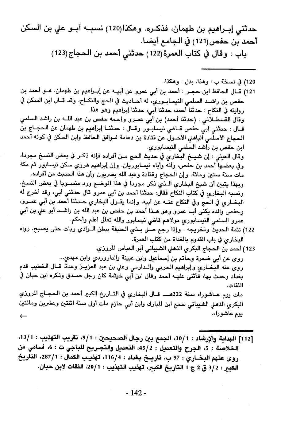 حَدثنِي إِبْرَاهِيم بن طهْمَان فَذكره وَهَكَذَا نسبه أَبُو عَليّ بن السكن أَحْمد بن حَفْص فِي الْجَامِع أَيْضا