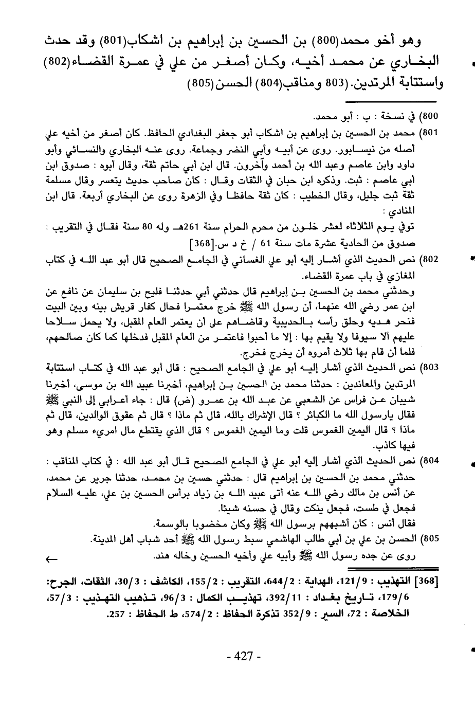 وَهُوَ أَخُو مُحَمَّد بن الْحُسَيْن بن إِبْرَاهِيم بن اشكاب وَقد حدث البُخَارِيّ عَن مُحَمَّد أَخِيه وَكَانَ أَصْغَر من عَليّ فِي عمْرَة الْقَضَاء واستتابة الْمُرْتَدين ومناقب الْحسن