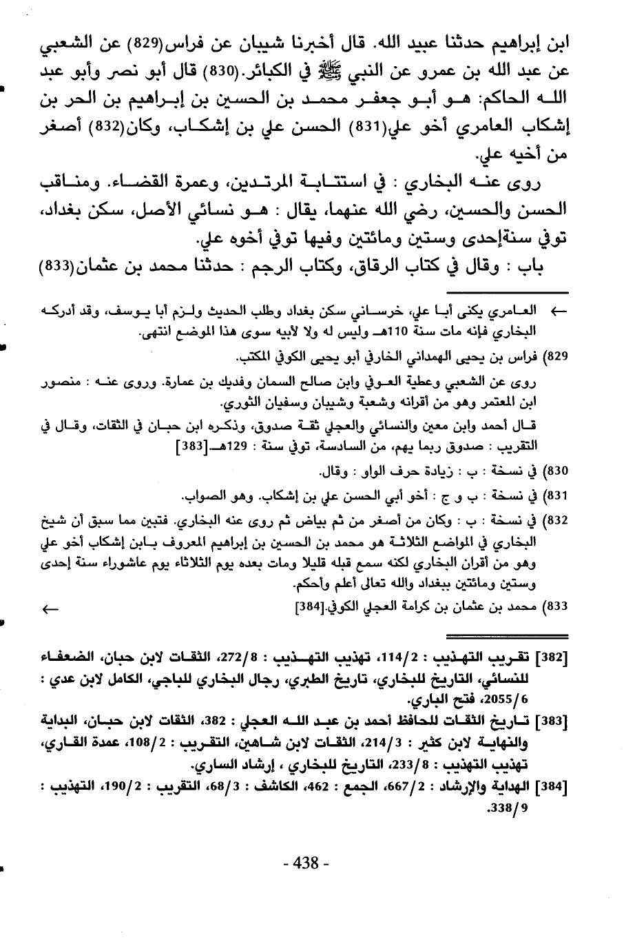 ابْن إِبْرَاهِيم حَدثنَا عبيد الله قَالَ أخبرنَا شَيبَان عَن فراس عَن الشّعبِيّ عَن عبد الله بن عَمْرو عَن النَّبِي صلى الله عَلَيْهِ وَسلم فِي الْكَبَائِر قَالَ أَبُو نصر وَأَبُو عبد الله الْحَاكِم هُوَ أَبُو جَعْفَر مُحَمَّد بن الْحُسَيْن بن إِبْرَاهِيم بن الْحر بن إشكاب العامري أَخُو عَليّ الْحسن عَليّ بن إشكاب وَكَانَ أَصْغَر من أَخِيه عَليّ