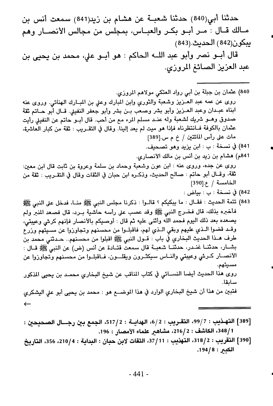حَدثنَا أبي حَدثنَا شُعْبَة عَن هِشَام بن زيد سَمِعت أنس بن مَالك قَالَ مر أَبُو بكر وَالْعَبَّاس بِمَجْلِس من مجَالِس الْأَنْصَار وهم يَبْكُونَ الحَدِيث