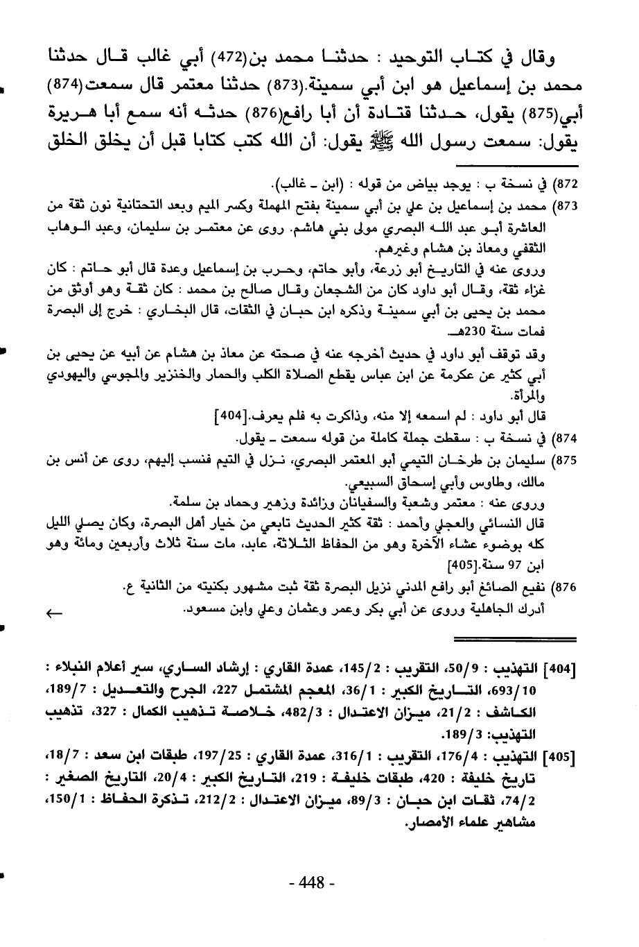 وَقَالَ فِي كتاب التَّوْحِيد حَدثنَا مُحَمَّد بن أبي غَالب قَالَ حَدثنَا مُحَمَّد بن إِسْمَاعِيل هُوَ ابْن أبي سَمِينَة حَدثنَا مُعْتَمر قَالَ سَمِعت أبي يَقُول حَدثنَا قَتَادَة أَن أَبَا رَافع حَدثهُ أَنه سمع أَبَا هُرَيْرَة يَقُول سَمِعت رَسُول الله صلى الله عَلَيْهِ وَسلم يَقُول أَن الله كتب كتابا قبل أَن يخلق الْخلق