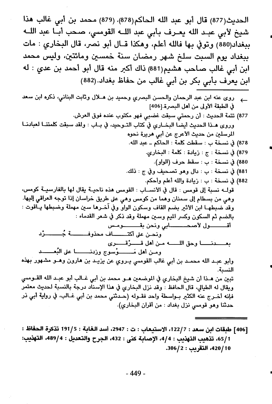 الحَدِيث قَالَ أَبُو عبد الله الْحَاكِم مُحَمَّد بن أبي غَالب هَذَا شيخ لأبي عبد الله يعرف بِأبي عبد الله القومسي صحب أَبَا عبد الله بِبَغْدَاد وَتُوفِّي بهَا فَالله أعلم وَهَكَذَا قَالَ أَبُو نصر قَالَ البُخَارِيّ مَاتَ بِبَغْدَاد يَوْم السبت سلخ شهر رَمَضَان سنة خمسين وَمِائَتَيْنِ وَلَيْسَ مُحَمَّد ابْن أبي غَالب صَاحب هشيم ذَاك أكبر مِنْهُ قَالَ أَبُو أَحْمد بن عدي لَهُ ابْن يعرف بِأبي بكر بن أبي غَالب من حفاظ بَغْدَاد