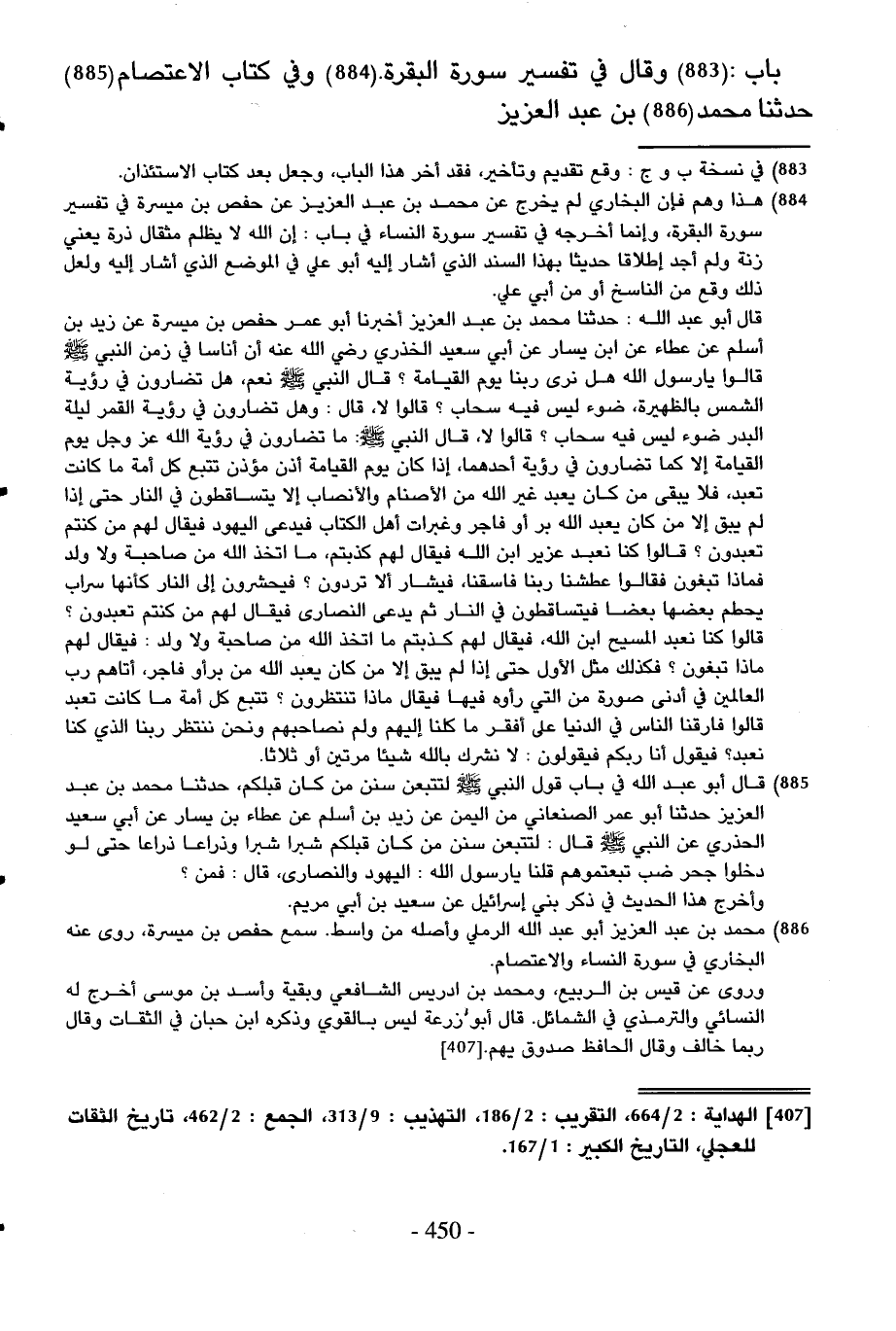بَاب وَقَالَ فِي تَفْسِير سُورَة الْبَقَرَة وَفِي كتاب الِاعْتِصَام حَدثنَا مُحَمَّد بن عبد الْعَزِيز