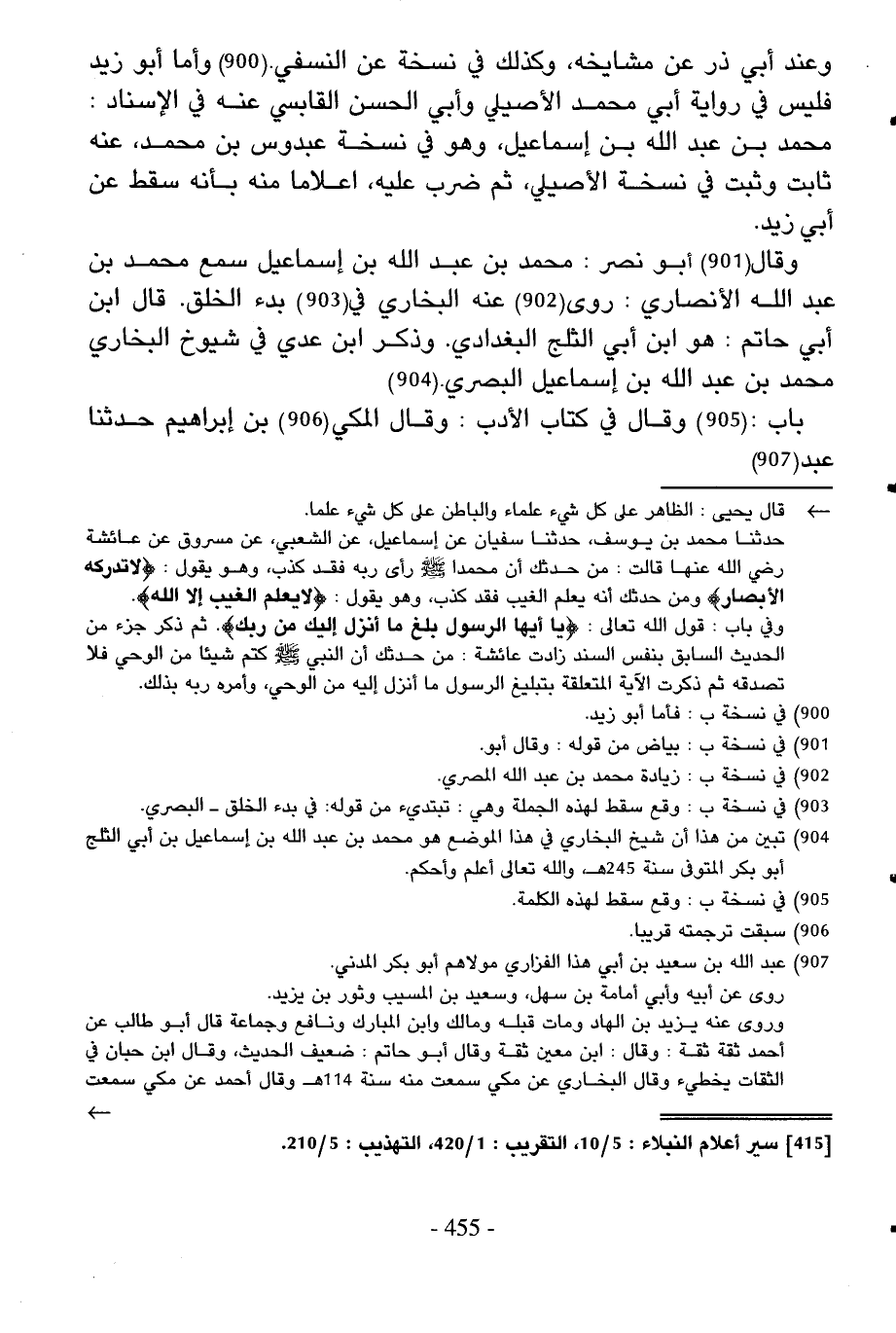 وَقَالَ أَبُو نصر مُحَمَّد بن عبد الله بن إِسْمَاعِيل سمع مُحَمَّد بن عبد الله الْأنْصَارِيّ روى عَنهُ البُخَارِيّ فِي بَدْء الْخلق قَالَ ابْن أبي حَاتِم هُوَ ابْن أبي الثَّلج الْبَغْدَادِيّ وَذكر ابْن عدي فِي شُيُوخ البُخَارِيّ مُحَمَّد بن عبد الله بن إِسْمَاعِيل الْبَصْرِيّ