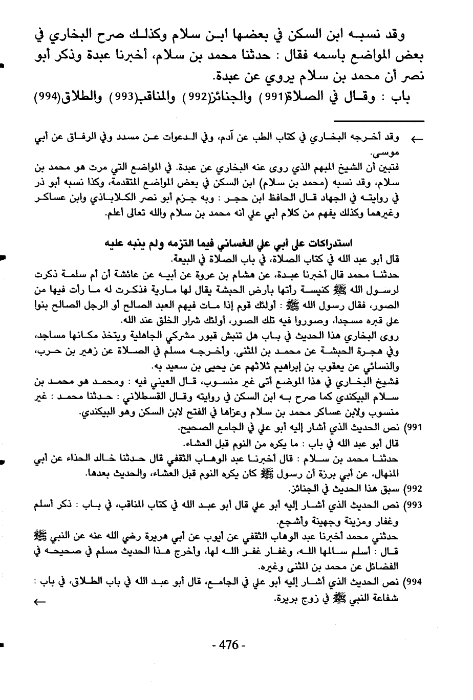 وَقد نسبه ابْن السكن فِي بَعْضهَا ابْن سَلام وَكَذَلِكَ صرح البُخَارِيّ فِي بعض الْمَوَاضِع باسمه فَقَالَ حَدثنَا مُحَمَّد بن سَلام أخبرنَا عَبدة وَذكر أَبُو نصر أَن مُحَمَّد بن سَلام يروي عَن عَبدة