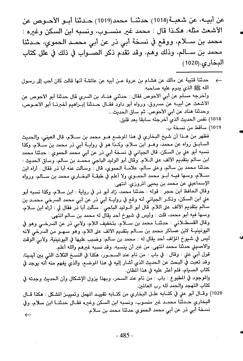 عَن أَبِيه عَن شُعْبَة حَدثنَا مُحَمَّد حَدثنَا أَبُو الْأَحْوَص عَن الْأَشْعَث مثله هَكَذَا قَالَ مُحَمَّد غير مَنْسُوب وَنسبه ابْن السكن وَغَيره مُحَمَّد بن سَلام وَوَقع فِي نُسْخَة أبي ذَر عَن أبي مُحَمَّد الْحَمَوِيّ حَدثنَا مُحَمَّد بن سَالم وَذَلِكَ وهم وَقد تقدم ذكر الصَّوَاب فِي ذَلِك فِي علل كتاب البُخَارِيّ