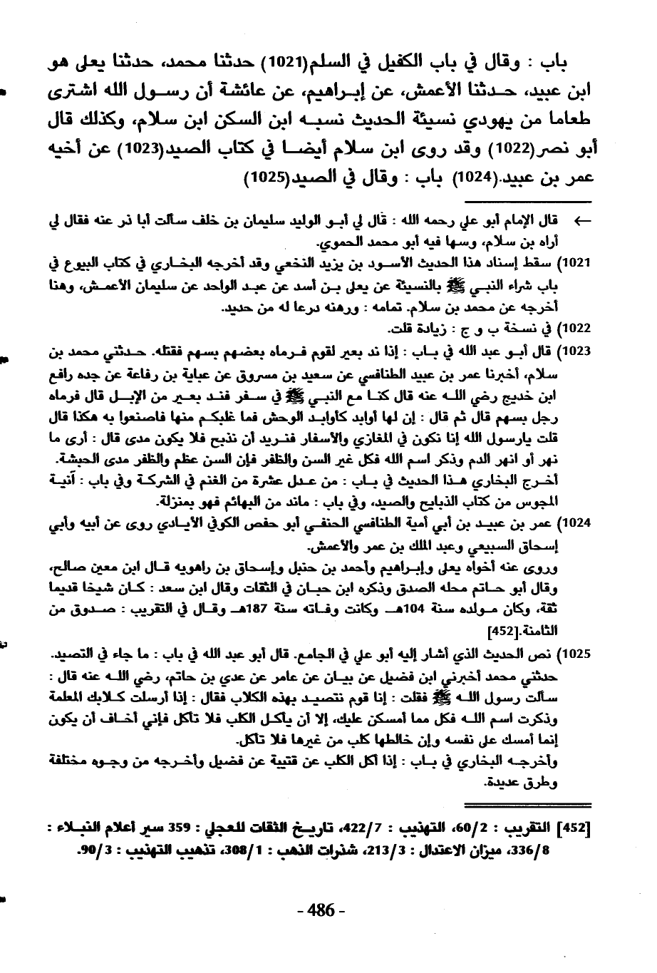 بَاب وَقَالَ فِي بَاب الْكَفِيل فِي السّلم حَدثنَا مُحَمَّد حَدثنَا يعلى هُوَ ابْن عبيد حَدثنَا الْأَعْمَش عَن إِبْرَاهِيم عَن عَائِشَة أَن رَسُول الله اشْترى طَعَاما من يَهُودِيّ نَسِيئَة الحَدِيث نسبه ابْن السكن ابْن سَلام وَكَذَلِكَ قَالَ أَبُو نصر وَقد روى ابْن سَلام أَيْضا فِي كتاب الصَّيْد عَن أَخِيه عمر بن عبيد بَاب وَقَالَ فِي الصَّيْد