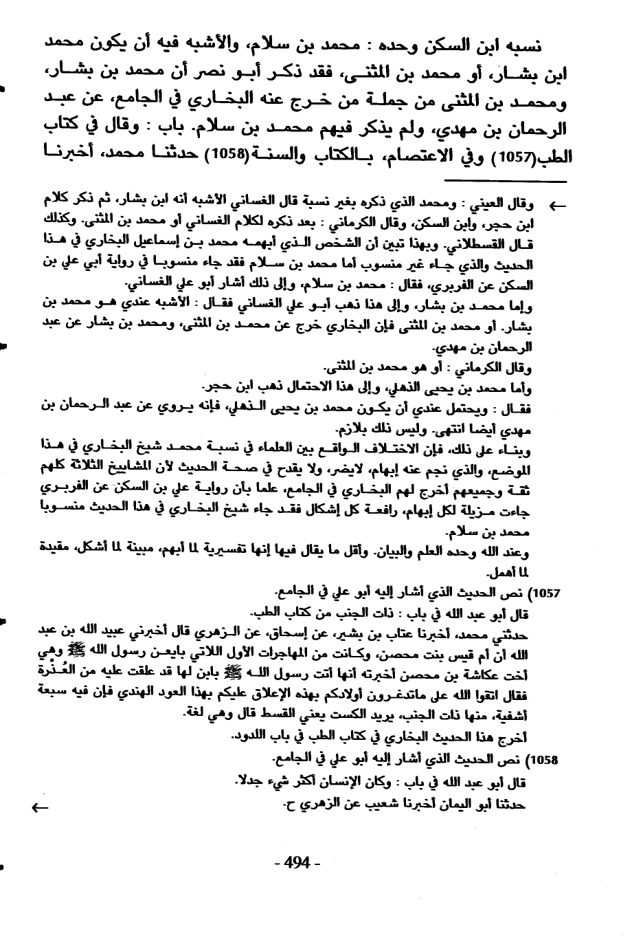نسبه ابْن السكن وَحده مُحَمَّد بن سَلام وَالْأَشْبَه فِيهِ أَن يكون مُحَمَّد ابْن بشار أَو مُحَمَّد بن الْمثنى فقد ذكر أَبُو نصر أَن مُحَمَّد بن بشار وَمُحَمّد بن الْمثنى من جملَة من خرج عَنهُ البُخَارِيّ فِي الْجَامِع عَن عبد الرحمان بن مهْدي وَلم يذكر فيهم مُحَمَّد بن سَلام بَاب وَقَالَ فِي كتاب الطِّبّ وَفِي الِاعْتِصَام بِالْكتاب وَالسّنة حَدثنَا مُحَمَّد أخبرنَا