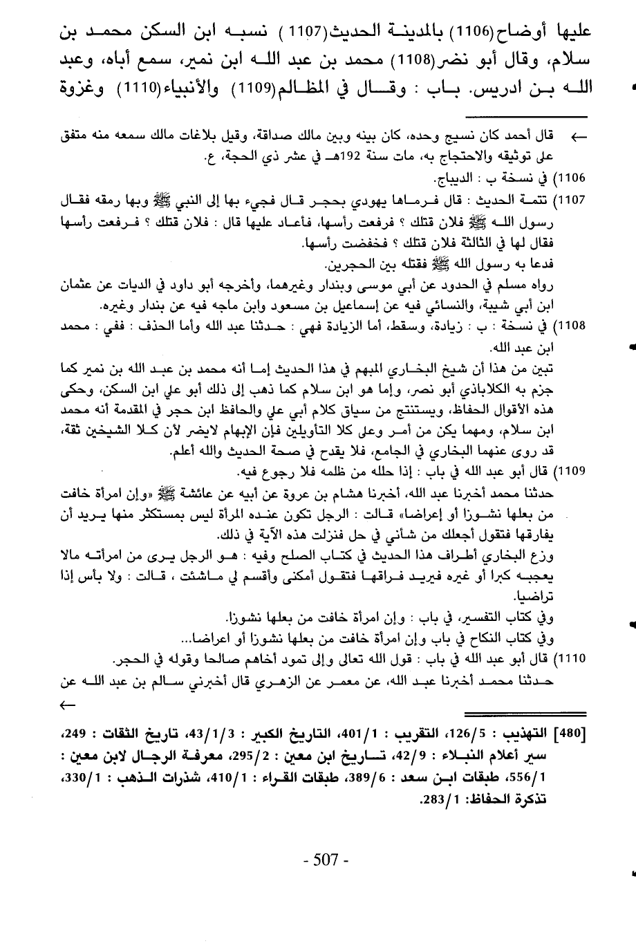 عَلَيْهَا أوضاح بِالْمَدِينَةِ الحَدِيث نسبه ابْن السكن مُحَمَّد بن سَلام وَقَالَ أَبُو نضر مُحَمَّد بن عبد الله ابْن نمير سمع أَبَاهُ وَعبد الله بن إِدْرِيس بَاب وَقَالَ فِي الْمَظَالِم والأنبياء وغزوة