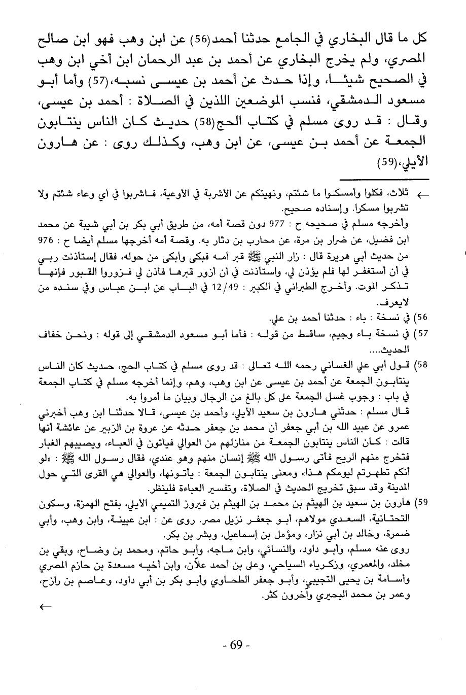 كل مَا قَالَ البُخَارِيّ فِي الْجَامِع حَدثنَا أَحْمد عَن ابْن وهب فَهُوَ ابْن صَالح الْمصْرِيّ وَلم يخرج البُخَارِيّ عَن أَحْمد بن عبد الرحمان ابْن أخي ابْن وهب فِي الصَّحِيح شَيْئا وَإِذا حدث عَن أَحْمد بن عِيسَى نسبه وَأما أَبُو مَسْعُود الدِّمَشْقِي فنسب الْمَوْضِعَيْنِ اللَّذين فِي الصَّلَاة أَحْمد بن عِيسَى وَقَالَ قد روى مُسلم فِي كتاب الْحَج حَدِيث كَانَ النَّاس ينتابون الْجُمُعَة عَن أَحْمد بن عِيسَى عَن ابْن وهب وَكَذَلِكَ روى عَن هَارُون الْأَيْلِي