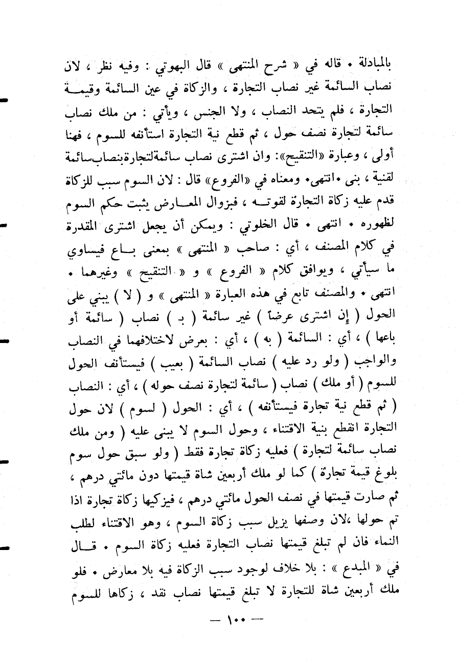 بِالْمُبَادَلَةِ. قَالَهُ فِي " شَرْحِ الْمُنْتَهَى " قَالَ الْبُهُوتِيُّ: وَفِيهِ نَظَرٌ، لِأَنَّ نِصَابَ السَّائِمَةِ غَيْرُ نِصَابِ التِّجَارَةِ، وَالزَّكَاةُ فِي عَيْنِ السَّائِمَةِ وَقِيمَةِ التِّجَارَةِ، فَلَمْ يَتَّحِدْ النِّصَابُ، وَلَا الْجِنْسُ، وَيَأْتِي: مَنْ مَلَكَ نِصَابَ سَائِمَةٍ لِتِجَارَةٍ نِصْفَ حَوْلِهِ، ثُمَّ قَطَعَ نِيَّةَ التِّجَارَةِ اسْتَأْنَفَهُ لِلسَّوْمِ، فَهُنَا أَوْلَى، وَعِبَارَةُ " التَّنْقِيحِ ": وَإِنْ اشْتَرَى نِصَابَ سَائِمَةٍ لِتِجَارَةٍ بِنِصَابِ سَائِمَةٍ لِقِنْيَةٍ، بَنَى. انْتَهَى. وَمَعْنَاهُ فِي " الْفُرُوعِ " قَالَ: لِأَنَّ السَّوْمَ سَبَبٌ لِلزَّكَاةِ قَدَّمَ عَلَيْهِ زَكَاةَ التِّجَارَةِ لِقُوَّتِهِ، فَبِزَوَالِ الْمُعَارِضِ يَثْبُتُ حُكْمُ السَّوْمِ لِظُهُورِهِ. انْتَهَى. قَالَ الْخَلْوَتِيُّ: وَيُمْكِنُ أَنْ يَجْعَلَ " اشْتَرَى الْمُقَدَّرَةَ " فِي كَلَامِ الْمُصَنَّفِ، أَيْ: صَاحِبِ " الْمُنْتَهَى " بِمَعْنَى " بَاعَ " فَيُسَاوِي مَا سَيَأْتِي، وَيُوَافِقُ كَلَامَ " الْفُرُوعِ " وَ " التَّنْقِيحِ " وَغَيْرِهِمَا. انْتَهَى. وَالْمُصَنِّفُ تَابَعَ فِي هَذِهِ الْعِبَارَةِ " الْمُنْتَهَى ". وَ (لَا) يَبْنِي عَلَى الْحَوْلِ (إنْ اشْتَرَى عَرْضًا) غَيْرَ سَائِمَةٍ (بِ) نِصَابِ (سَائِمَةٍ أَوْ بَاعَهَا) ، أَيْ: السَّائِمَةَ (بِهِ) ، أَيْ: بِعَرْضٍ لِاخْتِلَافِهِمَا فِي النِّصَابِ وَالْوَاجِبِ (وَلَوْ رُدَّ عَلَيْهِ) نِصَابُ السَّائِمَةِ (بِعَيْبٍ) فَيَسْتَأْنِفُ الْحَوْلَ لِلسَّوْمِ (أَوْ مَلَكَ) نِصَابَ (سَائِمَةٍ لِتِجَارَةٍ نِصْفَ حَوْلٍ) ، أَيْ: النِّصَابَ (ثُمَّ قَطَعَ نِيَّةَ تِجَارَةٍ فَيَسْتَأْنِفُهُ) ، أَيْ: الْحَوْلَ (لِسَوْمٍ) لِأَنَّ حَوْلَ التِّجَارَةِ انْقَطَعَ بِنِيَّةِ الِاقْتِنَاءِ، وَحَوْلُ السَّوْمِ لَا يُبْنَى عَلَيْهِ