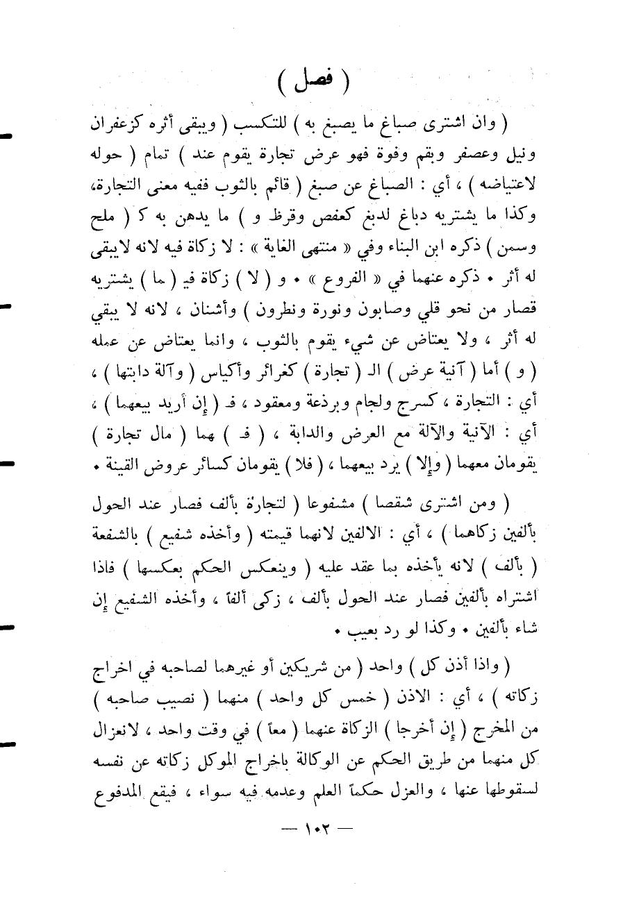 (فَصْلٌ) (وَإِنْ اشْتَرَى صَبَّاغٌ مَا يَصْبُغُ بِهِ) لِلتَّكَسُّبِ (وَيَبْقَى أَثَرُهُ كَزَعْفَرَانٍ وَنِيلٍ وَعُصْفُرٍ وَبَقَّمٍ وَفُوَّةٍ فَهُوَ عَرْضُ تِجَارَةٍ يُقَوَّمُ عِنْدَ) تَمَامِ (حَوْلِهِ لِاعْتِيَاضِهِ) ، أَيْ: الصَّبَّاغِ عَنْ صَبْغٍ (قَائِمٍ بِالثَّوْبِ فَفِيهِ مَعْنَى التِّجَارَةِ، وَكَذَا مَا يَشْتَرِيهِ دَبَّاغٌ لِدَبْغٍ كَعَفْصٍ وَقَرَظٍ وَ) مَا يُدْهَنُ بِهِ كَ (مِلْحٍ وَسَمْنٍ) ذَكَرَهُ ابْنُ الْبَنَّاءِ، وَفِي " مُنْتَهَى الْغَايَةِ ": لَا زَكَاةَ فِيهِ لِأَنَّهُ لَا يَبْقَى لَهُ أَثَرٌ، ذَكَرَهُ عَنْهُمَا فِي " الْفُرُوعِ ".