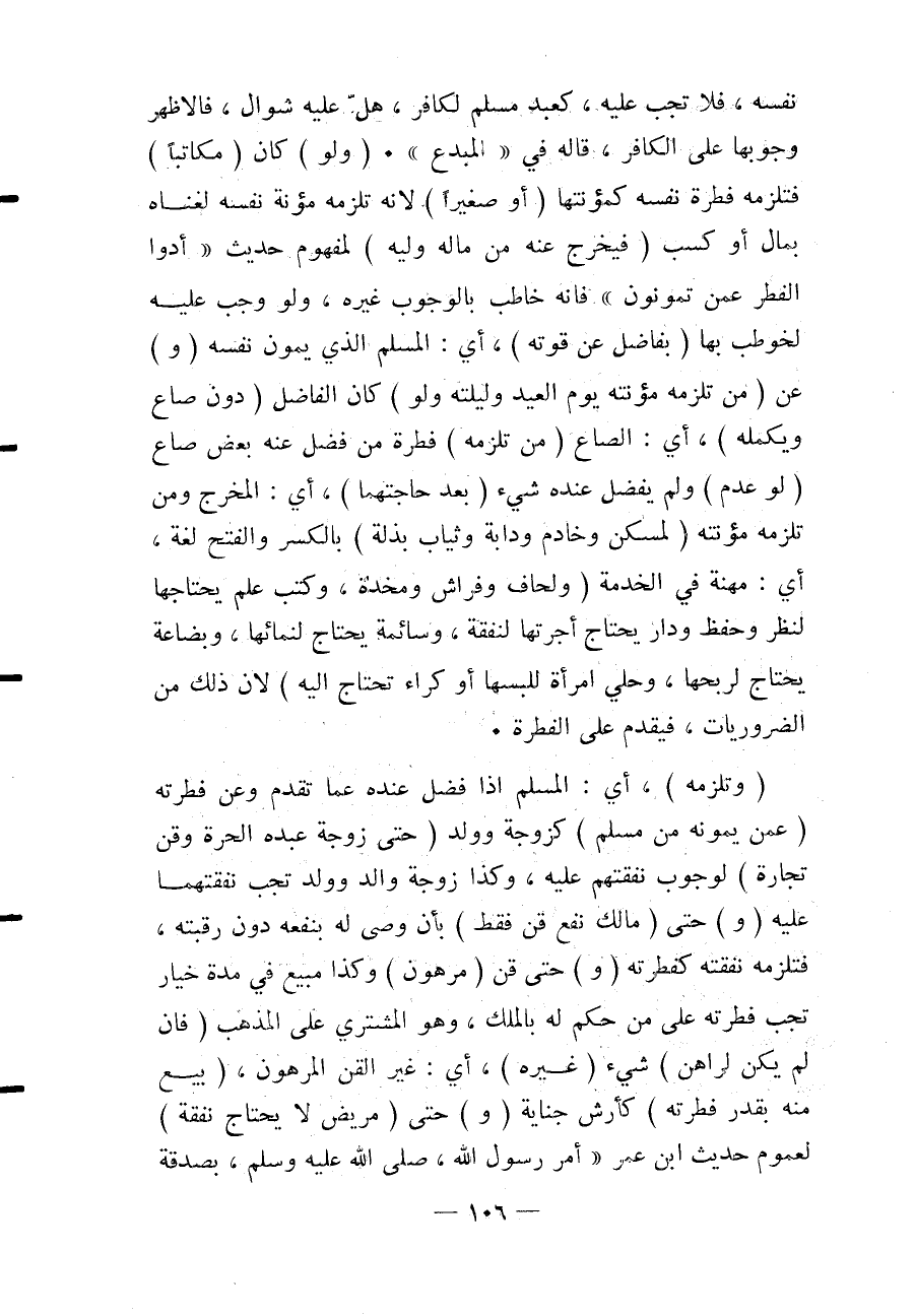 نَفْسَهُ، فَلَا تَجِبُ عَلَيْهِ، كَعَبْدٍ مُسْلِمٍ لِكَافِرٍ، هَلَّ عَلَيْهِ شَوَّالٌ، فَالْأَظْهَرُ وُجُوبُهَا عَلَى الْكَافِرِ، قَالَهُ فِي " الْمُبْدِعِ ". (وَلَوْ) كَانَ (مُكَاتَبًا) فَتَلْزَمُهُ فِطْرَةُ نَفْسِهِ كَمُؤْنَتِهَا (أَوْ صَغِيرًا) لِأَنَّهُ تَلْزَمُهُ مُؤْنَةُ نَفْسِهِ لِغِنَاهُ بِمَالٍ أَوْ كَسْبٍ (فَيُخْرِجُ عَنْهُ مِنْ مَالِهِ وَلِيُّهُ) لِمَفْهُومِ حَدِيثِ «أَدُّوا الْفِطْرَ عَمَّنْ تَمُونُونَ» فَإِنَّهُ خَاطَبَ بِالْوُجُوبِ غَيْرَهُ، وَلَوْ وَجَبَ عَلَيْهِ لَخُوطِبَ بِهَا (بِفَاضِلٍ عَنْ قُوتِهِ) ، أَيْ: الْمُسْلِمِ الَّذِي يُمَوِّنُ نَفْسَهُ (وَ) عَنْ (مَنْ تَلْزَمُهُ مُؤْنَتُهُ يَوْمَ الْعِيدِ وَلَيْلَتَهُ وَلَوْ) كَانَ الْفَاضِلُ (دُونَ صَاعٍ وَيُكْمِلُهُ) ، أَيْ: الصَّاعَ (مَنْ تَلْزَمُهُ) فِطْرَةُ مَنْ فَضَلَ عَنْهُ بَعْضُ صَاعٍ (لَوْ عَدِمَ) وَلَمْ يَفْضُلْ عِنْدَهُ شَيْءٌ (بَعْدَ حَاجَتِهِمَا) ، أَيْ: الْمُخْرِجِ وَمَنْ تَلْزَمُهُ مُؤْنَتُهُ (لِمَسْكَنٍ وَخَادِمٍ وَدَابَّةٍ وَثِيَابٍ بِذْلَةٍ) بِالْكَسْرِ، وَالْفَتْحُ لُغَةٌ، أَيْ: مِهْنَةٍ فِي الْخِدْمَةِ (وَلِحَافٍ وَفِرَاشٍ وَمِخَدَّةٍ، وَكُتُبِ عِلْمٍ يَحْتَاجُهَا لِنَظَرٍ وَحِفْظٍ وَدَارٍ يَحْتَاجُ أُجْرَتَهَا لِنَفَقَةٍ، وَسَائِمَةٍ يَحْتَاجُ لِنَمَائِهَا، وَبِضَاعَةٍ يَحْتَاجُ لِرِبْحِهَا، وَحُلِيِّ امْرَأَةٍ لِلُبْسِهَا أَوْ كِرَاءٍ تَحْتَاجُ إلَيْهِ) لِأَنَّ ذَلِكَ مِنْ الضَّرُورِيَّاتِ، فَيُقَدَّمُ عَلَى الْفِطْرَةِ. (وَتَلْزَمُهُ) ، أَيْ: الْمُسْلِمَ إذَا فَضَلَ عِنْدَهُ عَمَّا تَقَدَّمَ وَعَنْ فِطْرَتِهِ (عَمَّنْ يُمَوِّنُهُ مِنْ مُسْلِمٍ) كَزَوْجَةٍ وَوَلَدٍ (حَتَّى زَوْجَةِ عَبْدِهِ الْحُرَّةَ وَقِنِّ تِجَارَةٍ) لِوُجُوبِ نَفَقَتِهِمْ عَلَيْهِ، وَكَذَا زَوْجَةُ وَالِدٍ وَوَلَدٍ تَجِبُ نَفَقَتُهُمَا عَلَيْهِ.