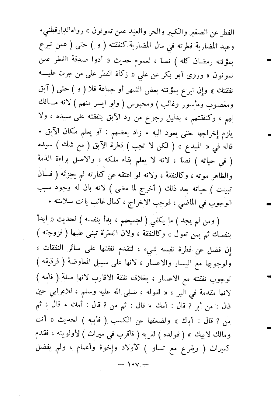 الْفِطْرِ عَنْ الصَّغِيرِ وَالْكَبِيرِ وَالْحُرِّ وَالْعَبْدِ عَمَّنْ تَمُونُونَ» رَوَاهُ الدَّارَقُطْنِيّ. وَعَبْدُ الْمُضَارَبَةِ فِطْرَتُهُ فِي مَالِ الْمُضَارَبَةِ كَنَفَقَتِهِ (وَ) حَتَّى (عَمَّنْ تَبَرَّعَ بِمُؤْنَتِهِ رَمَضَانَ كُلَّهُ) نَصًّا، لِعُمُومِ حَدِيثِ «أَدُّوا صَدَقَةَ الْفِطْرِ عَمَّنْ تَمُونُونَ» وَرَوَى أَبُو بَكْرٍ عَنْ عَلِيٍّ " زَكَاةُ الْفِطْرِ عَلَى مَنْ جَرَتْ عَلَيْهِ نَفَقَتُكَ " وَإِنْ تَبَرَّعَ بِمُؤْنَتِهِ بَعْضَ الشَّهْرِ أَوْ جَمَاعَةٌ فَلَا (وَ) حَتَّى (آبِقٍ وَمَغْصُوبٍ وَمَأْسُورٍ وَغَائِبٍ) وَمَحْبُوسٍ (وَلَوْ أَيْسَرَ مِنْهُمْ) لِأَنَّهُ مَالِكٌ لَهُمْ، وَكَنَفَقَتِهِمْ، بِدَلِيلِ رُجُوعِ مَنْ رَدَّ الْآبِقَ بِنَفَقَتِهِ عَلَى سَيِّدِهِ، وَلَا يَلْزَمُ إخْرَاجُهَا حَتَّى يَعُودَ إلَيْهِ. زَادَ بَعْضُهُمْ: أَوْ يَعْلَمَ مَكَانَ الْآبِقِ. قَالَ فِي " الْمُبْدِعِ " (لَكِنْ لَا تَجِبُ) فِطْرَةُ الْآبِقِ (مَعَ شَكِّ) سَيِّدِهِ (فِي حَيَاتِهِ) نَصًّا، لِأَنَّهُ لَا يَعْلَمُ بَقَاءَ مِلْكِهِ، وَالْأَصْلُ بَرَاءَةُ الذِّمَّةِ وَالظَّاهِرُ مَوْتُهُ، وَكَالنَّفَقَةِ، وَلِأَنَّهُ لَوْ أَعْتَقَهُ عَنْ كَفَّارَتِهِ لَمْ يُجْزِئْهُ (فَإِنْ تَبَيَّنَتْ) حَيَاتُهُ بَعْدَ ذَلِكَ (أَخْرَجَ لِمَا مَضَى) لِأَنَّهُ بَانَ لَهُ وُجُودٌ سَبَبُ الْوُجُوبِ فِي الْمَاضِي، فَوَجَبَ الْإِخْرَاجُ، كَمَالِ غَائِبٍ بَانَتْ سَلَامَتُهُ.