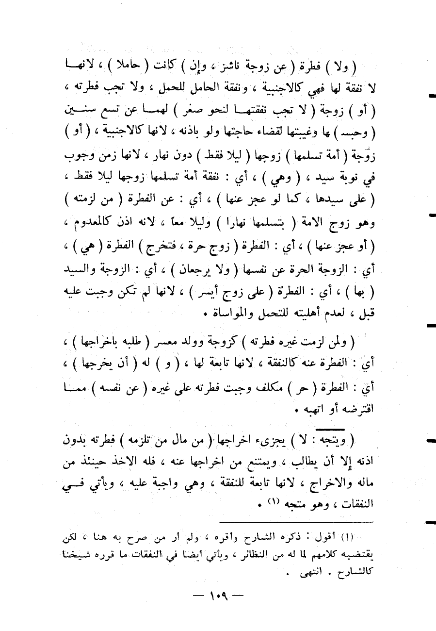 (وَلَا) فِطْرَةَ (عَنْ زَوْجَةٍ نَاشِزٍ، وَإِنْ) كَانَتْ (حَامِلًا) ، لِأَنَّهَا لَا نَفَقَةَ لَهَا فَهِيَ كَالْأَجْنَبِيَّةِ، وَنَفَقَةُ الْحَامِلِ لِلْحَمْلِ، وَلَا تَجِبُ فِطْرَتُهُ، (أَوْ) زَوْجَةٍ (لَا تَجِبُ نَفَقَتُهَا لِنَحْوِ صِغَرٍ) لَهُمَا عَنْ تِسْعِ سِنِينَ (وَحَبْسِ) هَا وَغِيبَتهَا لِقَضَاءِ حَاجَتِهَا وَلَوْ بِإِذْنِهِ، لِأَنَّهَا كَالْأَجْنَبِيَّةِ، (أَوْ) زَوْجَةٍ (أَمَةٍ تَسَلَّمَهَا) زَوْجُهَا (لَيْلًا فَقَطْ) دُونَ نَهَارٍ، لِأَنَّهَا زَمَنُ وُجُوبٍ فِي نَوْبَةِ سَيِّدٍ، (وَهِيَ) ، أَيْ: نَفَقَةُ أَمَةٍ تَسَلَّمَهَا زَوْجُهَا لَيْلًا فَقَطْ، (عَلَى سَيِّدِهَا، كَمَا لَوْ عَجَزَ عَنْهَا) ، أَيْ: عَنْ الْفِطْرَةِ (مَنْ لَزِمَتْهُ) وَهُوَ زَوْجُ الْأَمَةِ (بِتَسَلُّمِهَا نَهَارًا) وَلَيْلًا مَعًا، لِأَنَّهُ إذَنْ كَالْمَعْدُومِ، (أَوْ عَجَزَ عَنْهَا) ، أَيْ: الْفِطْرَةِ (زَوْجُ حُرَّةٍ، فَتُخْرِجُ) الْفِطْرَةَ (هِيَ) ، أَيْ: الزَّوْجَةُ الْحُرَّةَ عَنْ نَفْسِهَا.
